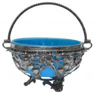 Henkelkorb mit kobaltblauem Glaseinsatz, 800er Silber, 1890/1910, Pralinenkorb