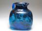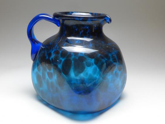 großer Krug mit Ausguß und Henkel, blaues Glas mit dunklen Einschmelzungen. Angesetzter blauer Henkel. Eckige Form, dickwandig. Abriss ausgeschliffen. Alters- und Gebrauchsspuren. Sehr guter gebrauchter Zustand.