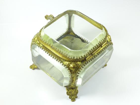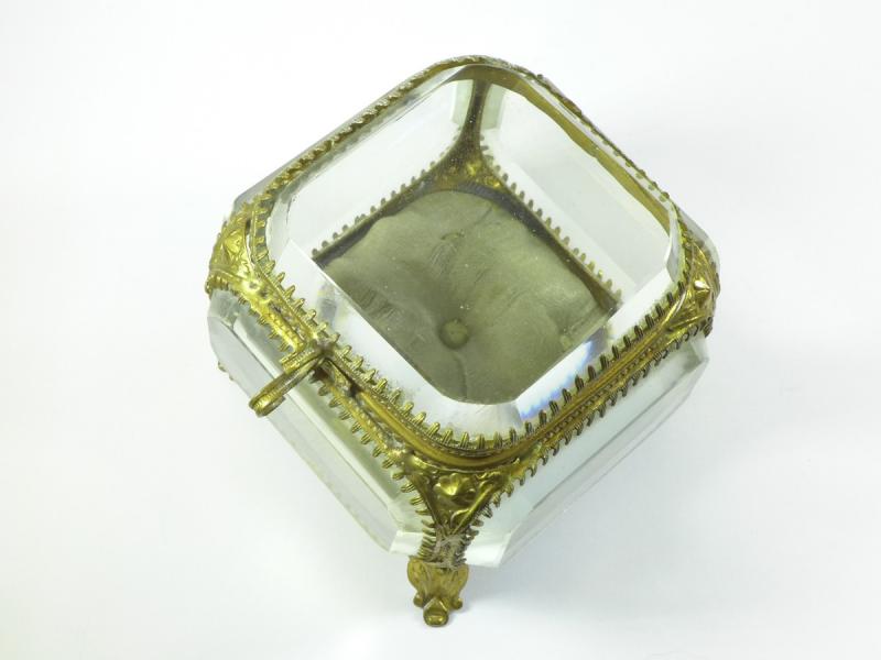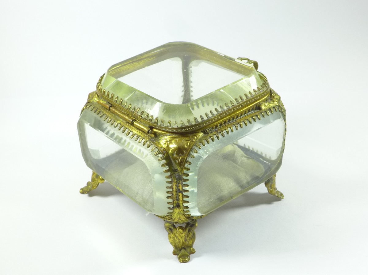 Schmuckschatulle, Schmuckkästchen, Biedermeier, 19. Jh.. Rechteckig mit dickem geschliffenen Glas, gesteppter Innenboden. Metallfassung. Alters- und Gebrauchsspuren. Gebrauchter Zustand.