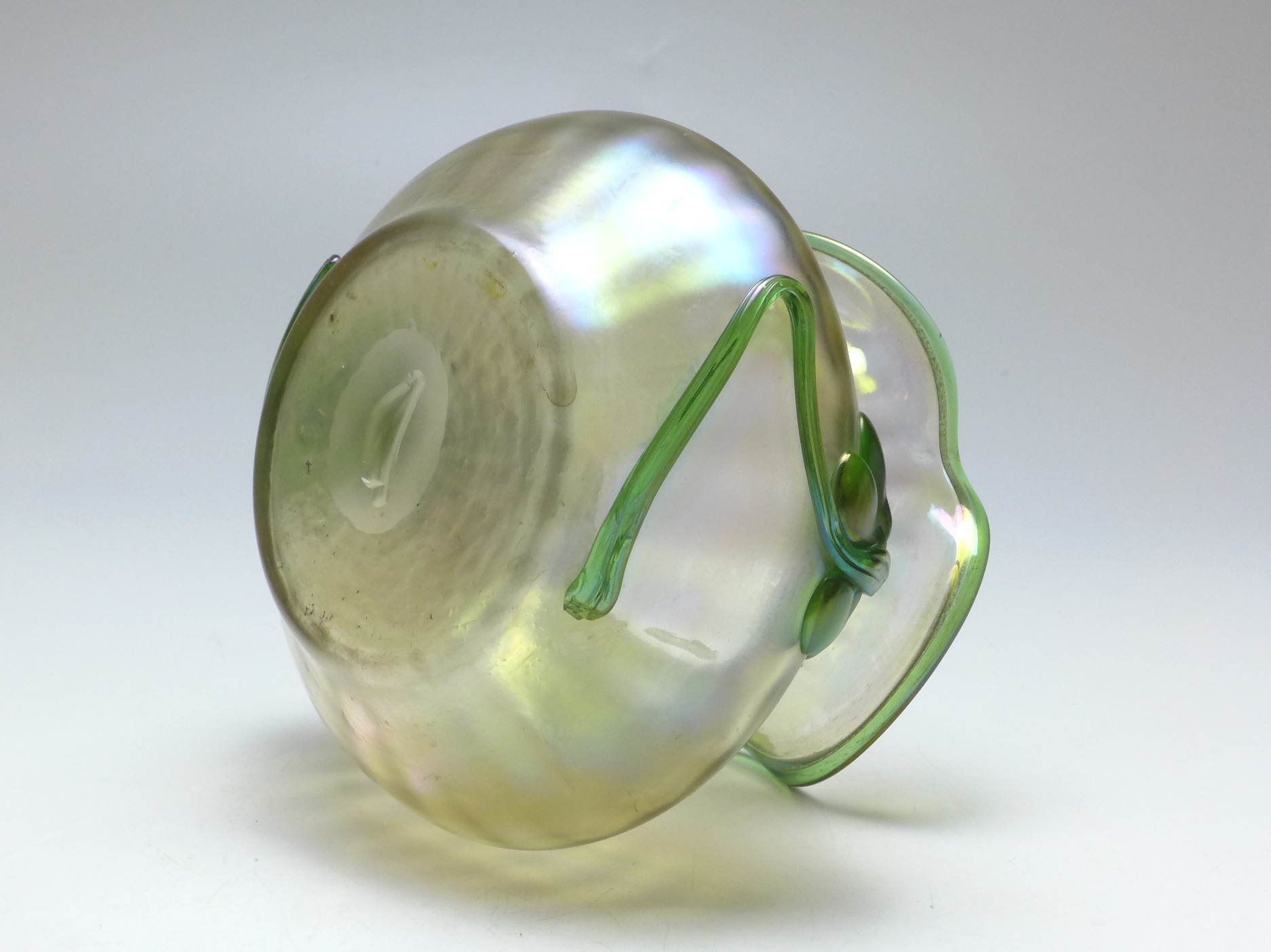 Vase, Joh. Loetz Witwe, Klostermühle, um 1900, farbloses Glas mit grünen Noppen in Blütenform und grünem Rand, irisierend, optisch geblasen, gedrückter Bauch, eingezogener Rand mit dreifacher ausgebogener Lippe. Alters- und Gebrauchsspuren. Guter gebrauchter Zustand.