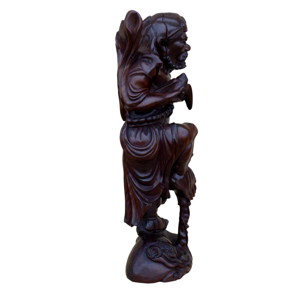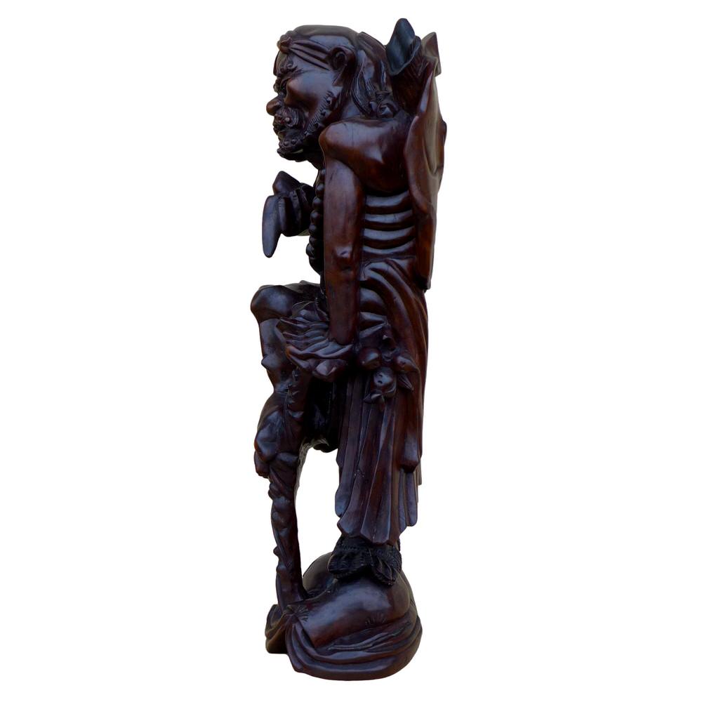 große Figur Li Tieguai (Pinyin Li Tieguai, W.-G. Li T'ieh-kuai) auch Tie Guai Li, ist ein berühmter daoistischer Unsterblicher der chinesischen Mythologie. „Li mit der eisernen Krücke“ gehört zur Gruppe der Acht Unsterblichen. Hartholz. Sehr detailreich geschnitzt und poliert. Der Hut aus Lotusblatt, ein Tuch um den Kopf, eine Fledermaus in einer Hand, Früchte etc.. Altersspuren. Trocknungsrisse. Reparierte kleine Bruchstelle links oben.