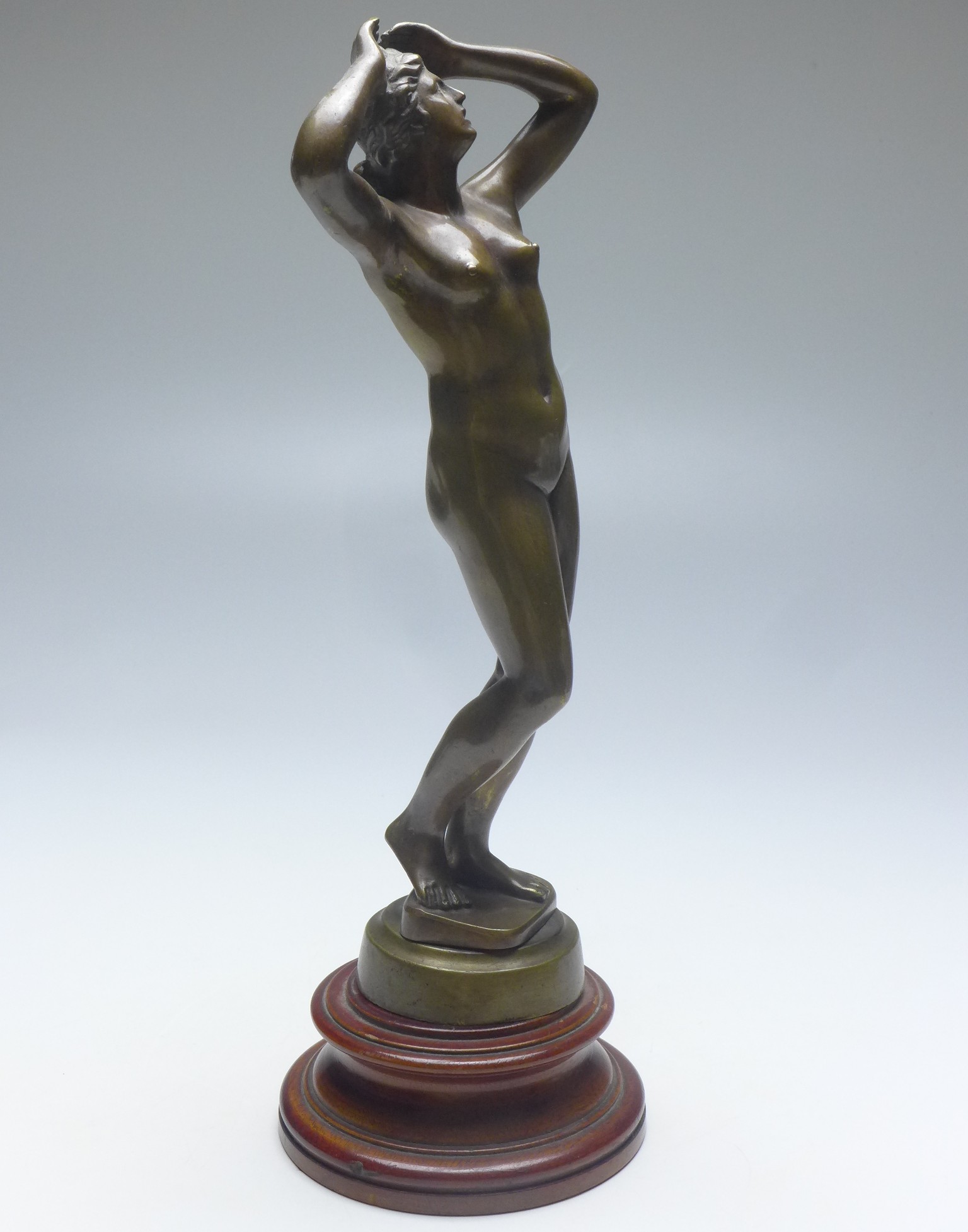 Bronzeskulptur Klagende Venus. Darstellung der mythologischen Figur Venus in Form eines stehenden weiblichen Akts mit erhobenen Armen und Haarknoten, einem Attribut der Göttin Venus. Venus ist die römische Göttin der Liebe, des erotischen Verlangens und der Schönheit. Altersspuren. Sehr guter Zustand.