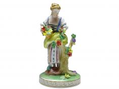 Porzellanfigur, Figur Gärtnerin, Blumenmädchen, Sächsische Porzellanmanufaktur Dresden, 20. Jh., Carl Thieme, Potschappel, mit Blumen, bunt staffiert, Goldrand. Marke im Boden. Altersspuren. Guter gebrauchter Zustand.