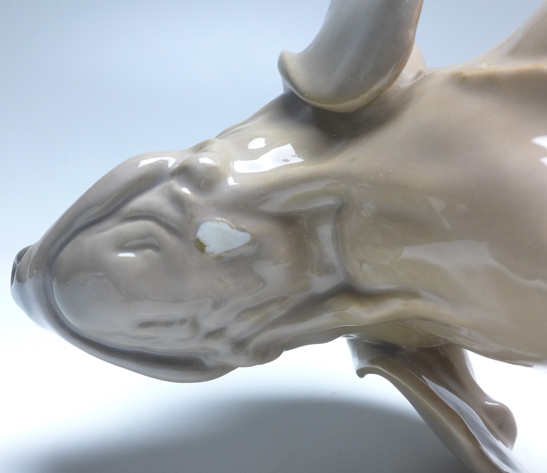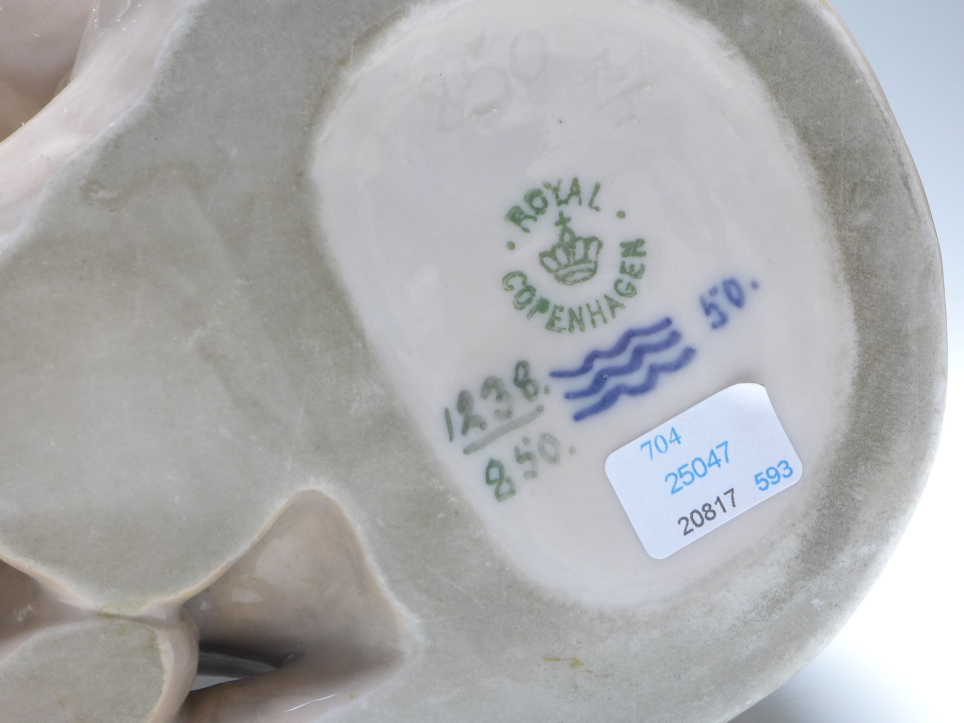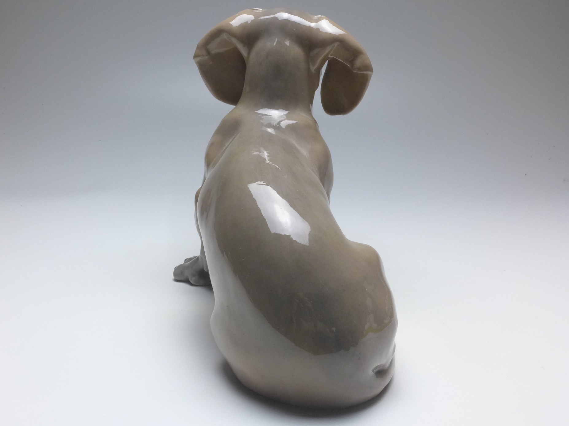 große alte Porzellanfigur sitzender Hund Dachshund, Royal Copenhagen, um 1900, sign. E. Nielsen (1857-1947), Modell 850/1238, Unterglasurdekor. Sehr ausdrucksvolle Darstellung. Marke im Boden. Alters- und Gebrauchsspuren. Guter gebrauchter Zustand, kleiner Glasurfehler unterm Kinn. Selten.