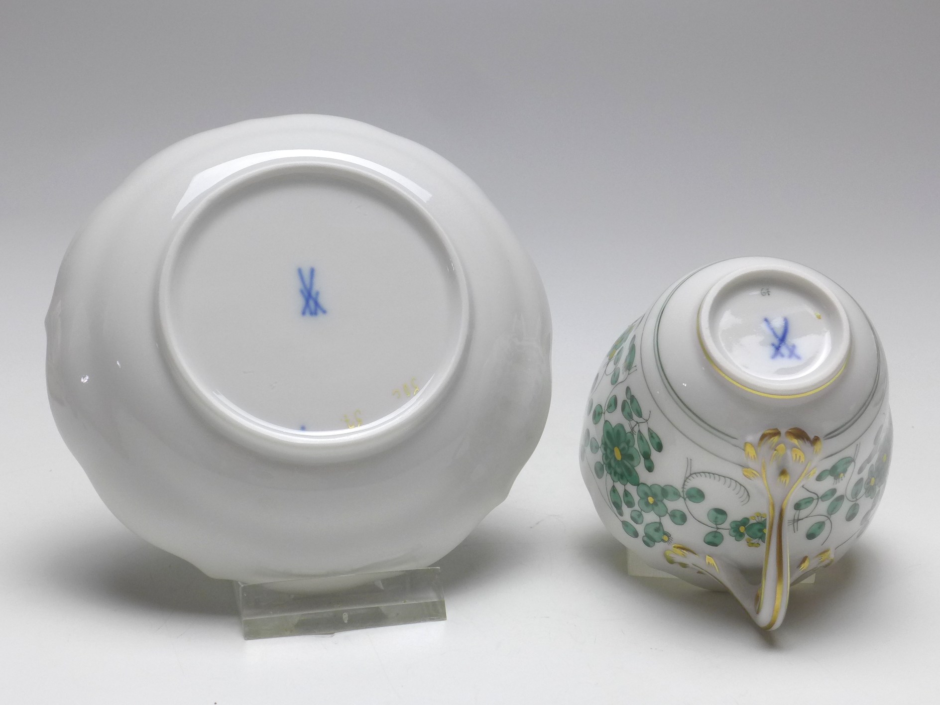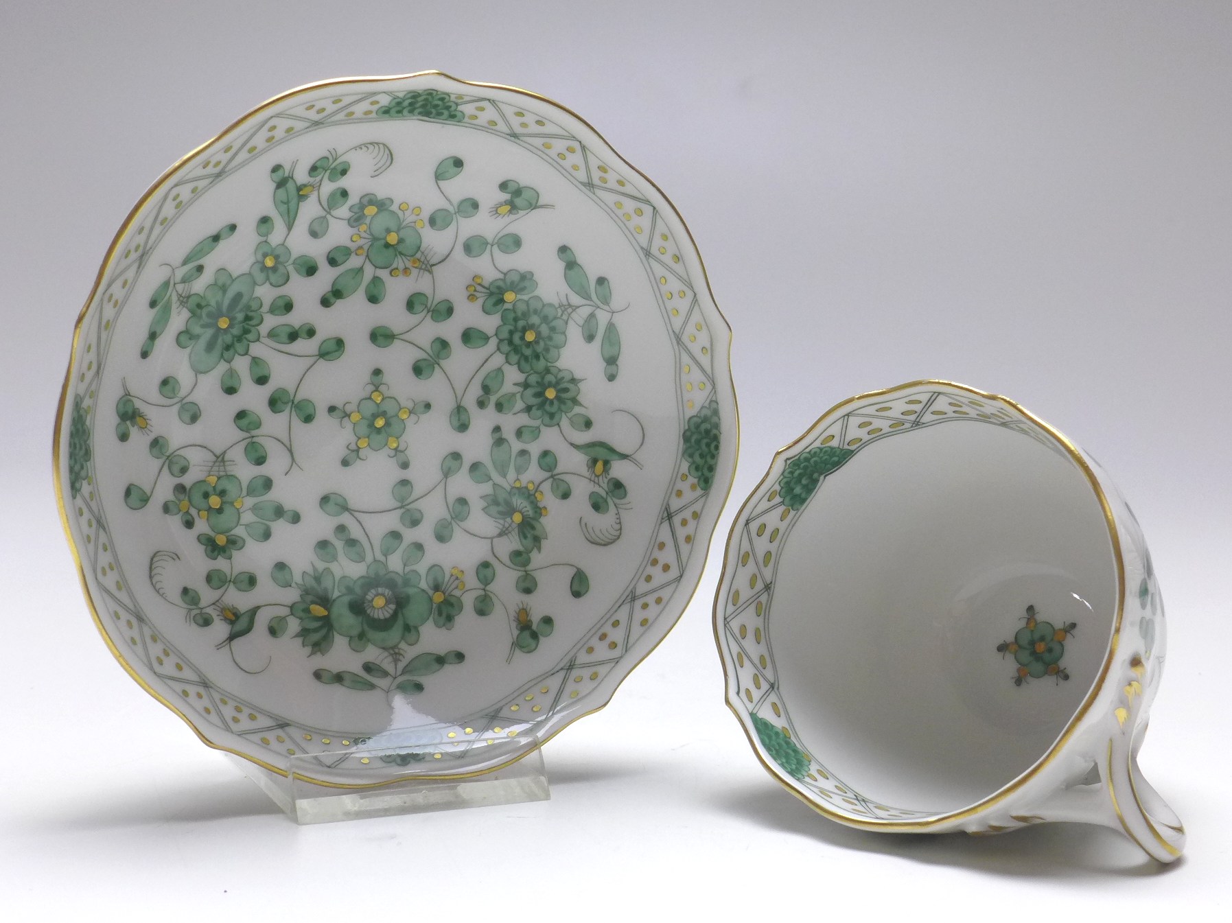 Mokkatasse, Espressotasse, Tasse mit Untertasse, Meissen, 20. Jh., 1. Wahl. Feine Handmalerei im Dekor Indische Malerei grün reich. Sehr guter gebrauchter Zustand.
