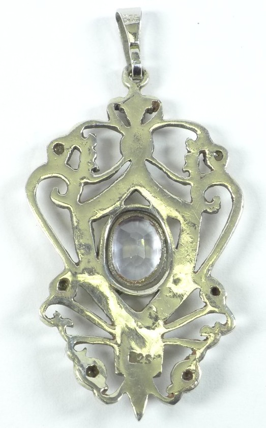 Anhänger aus 925er Silber, mittig blauer Stein, Markasitbesatz. Öse 835er Silber. Guter gebrauchter Zustand.
