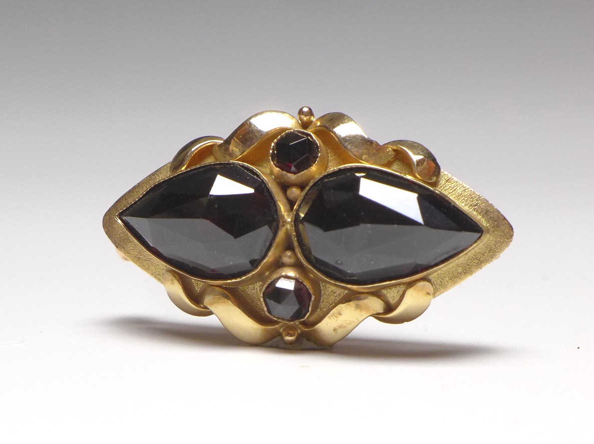 alte Brosche, 19. Jh., 585er Rose Gold punziert, besetzt mit 2 großen tropfenförmigen Granaten, flankiert von 2 runden Granaten und Girlanden. Guter gebrauchter Zustand. ca. 33 x 19 mm, Gewicht 5,26 g