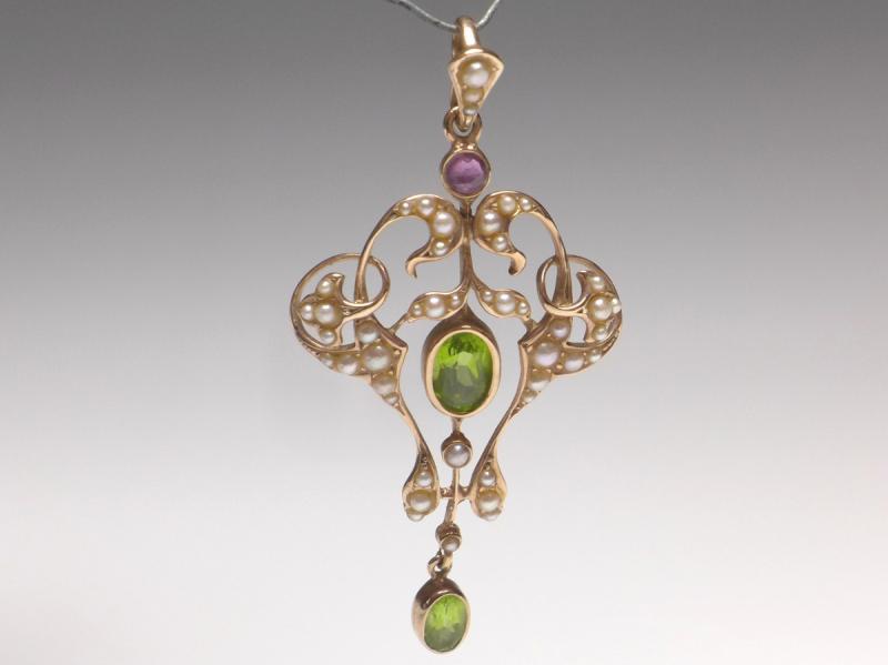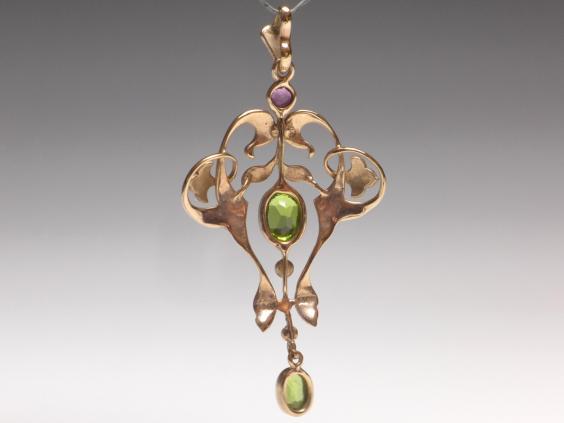sehr schöner alter viktorianischer Anhänger mit Steinen und Perlchen, um 1900, 333er Gold Rotgold punziert. Filigran gestaltet, oben kleiner Amethyst, mittig großer Peridot, eingerahmt von zahlreichen kleinen Saat Perlchen, unten beweglicher Peridot Anhänger. Anhängerschlaufe mit 3 kleinen Saatperlen. Guter gebrauchter Zustand. ca. L: 52 mm, Gewicht 3,88 g