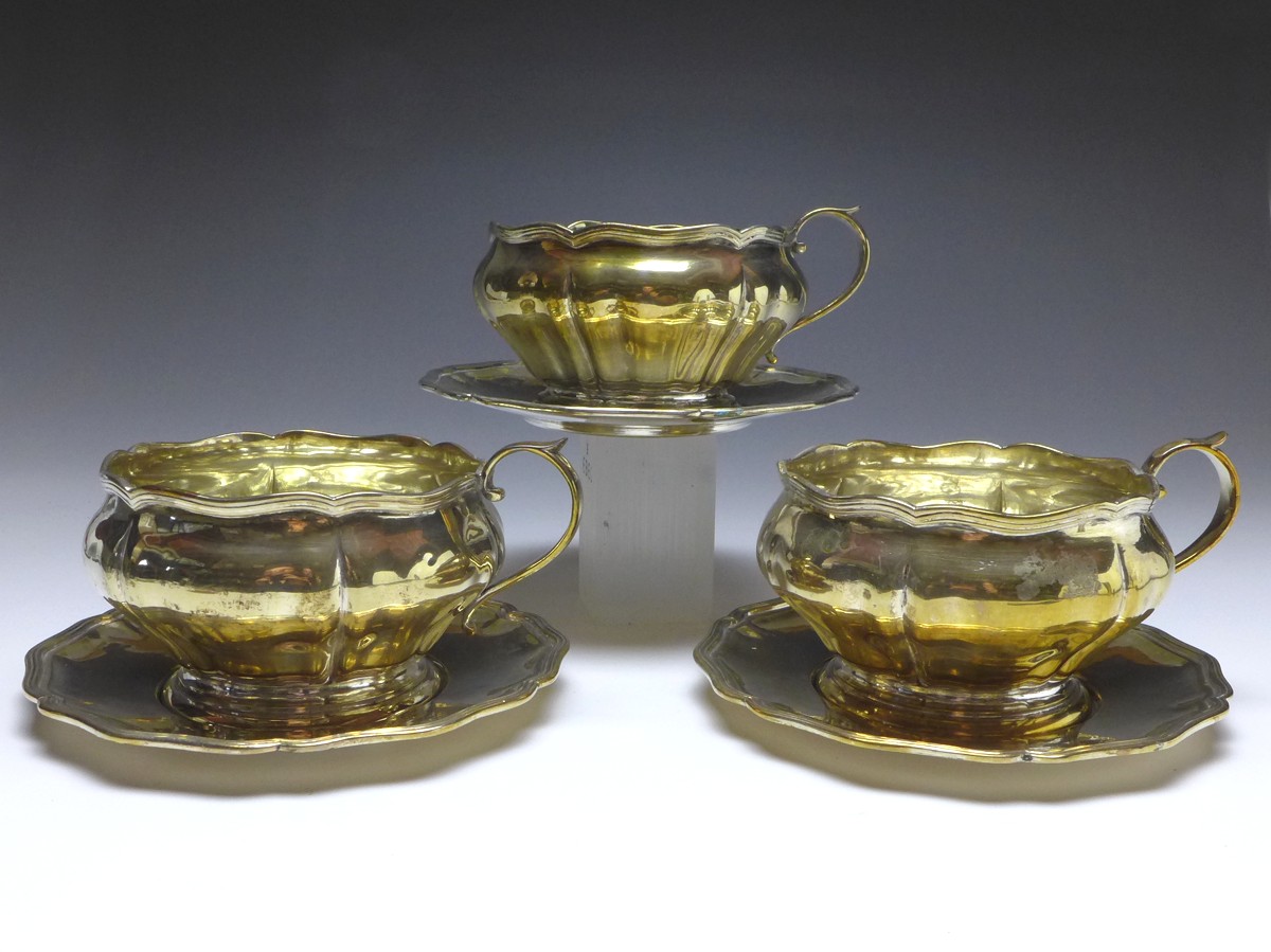 Set 3 Teetassen mit Untertassen, Rozet & Fischmeister, Kammerjuwelier in Wien, 1872-1922, 800er Silber, punziert mit Dianakopfmarke. Alters- und Gebrauchsspuren. Guter Zustand.