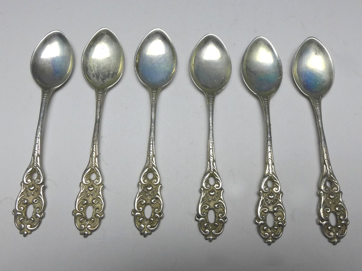 6x Mokkalöffel, Löffel, Espresso, Griffe mit Durchbruch. 800er Silber, pepunzt. Alters- und Gebrauchsspuren. Guter gebrauchter Zustand.