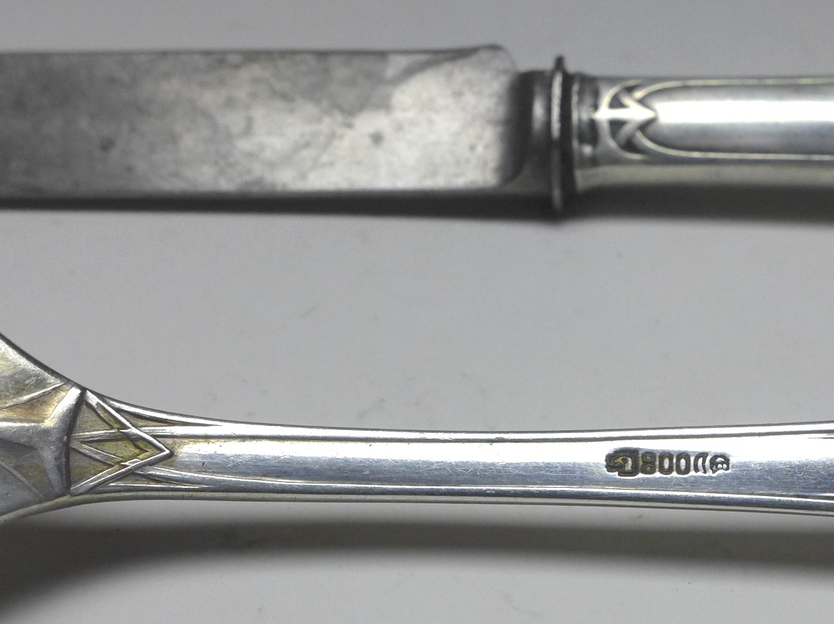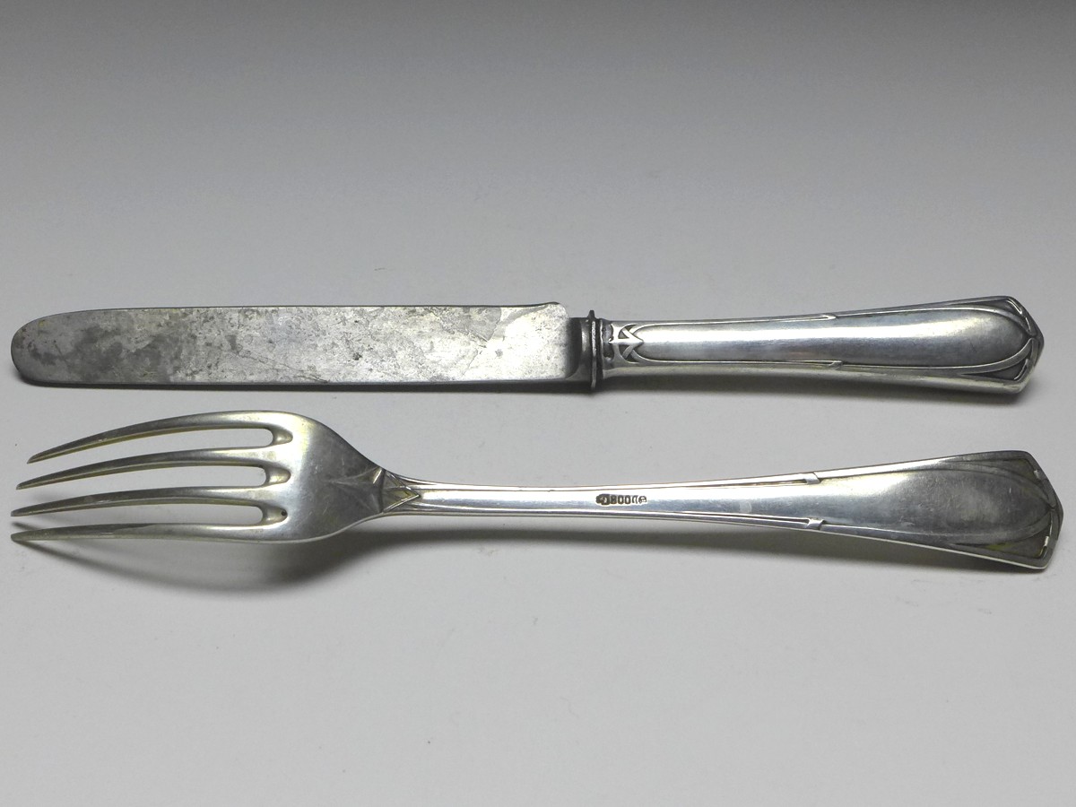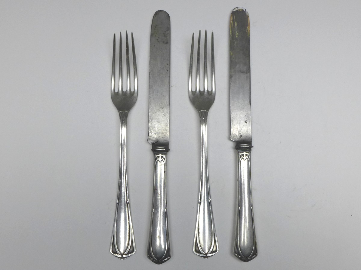 Besteck für Personen: 2x Messer, 2x Gabel, Franz Bahner AG, Düsseldorf (1895-1918), 800er Silber (Gabel, Messergriff). Serie 7100, Entwurf Peter Behrens. Gepunzt Halbmond, Krone, Herstellermarke. Alters- und Gebrauchsspuren. Guter gebrauchter Zustand. Klingen mit stärkeren Gebrauchsspuren.