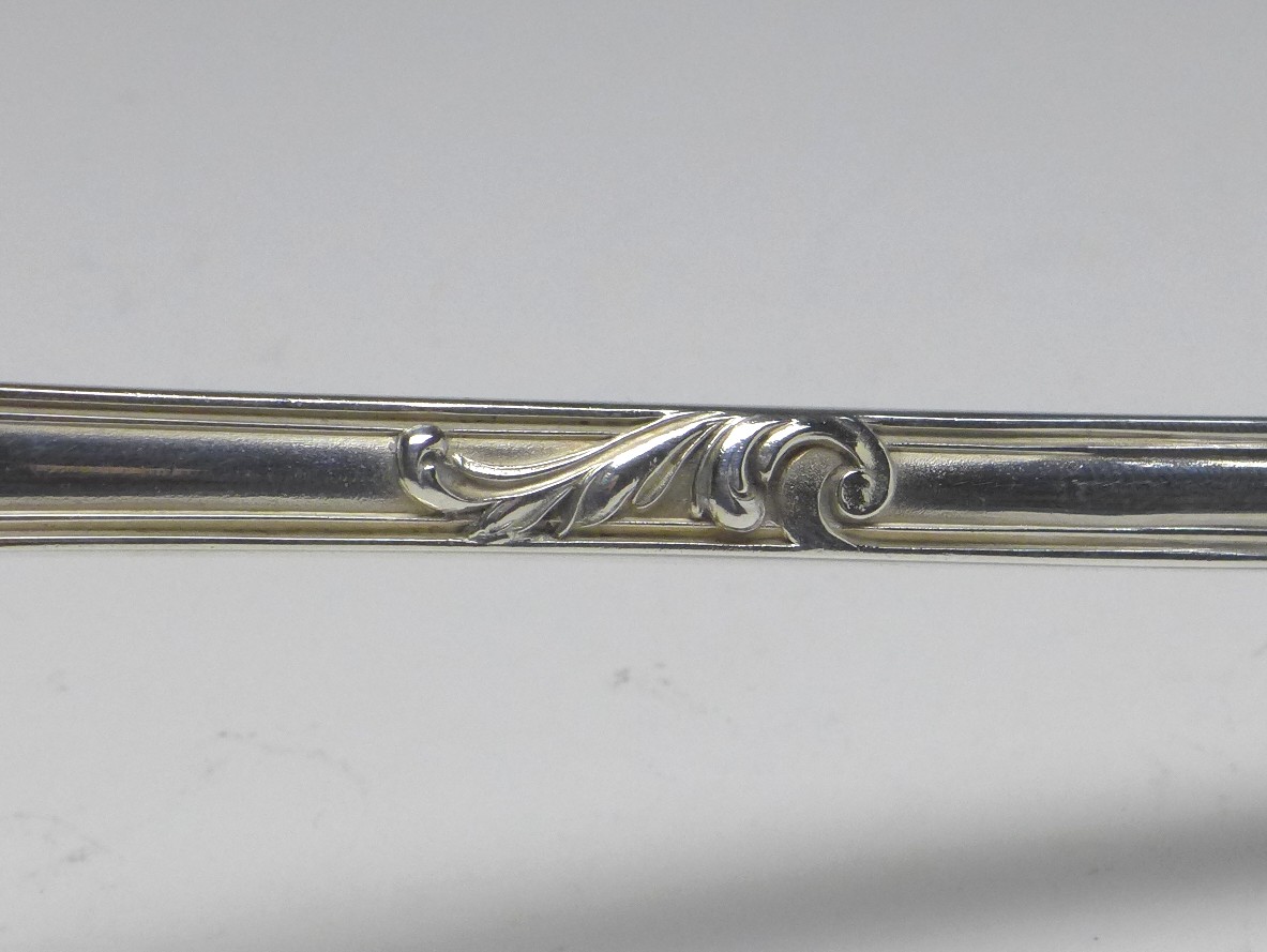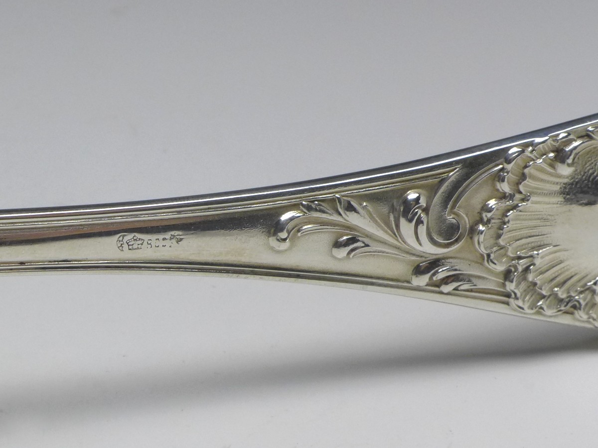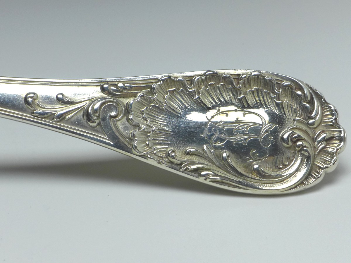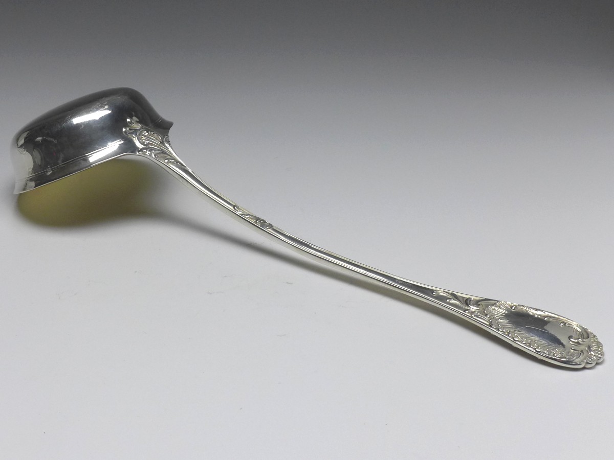 große Kelle, Suppenkelle, 800er Silber, Laffe innen vergoldet, Griff mit Muscheldekor und Monogramm. H. Meyen & Co., Berlin (1846-1950). Gepunzt Halbmond, Krone, Herstellermarke. Alters- und Gebrauchsspuren. Guter gebrauchter Zustand.