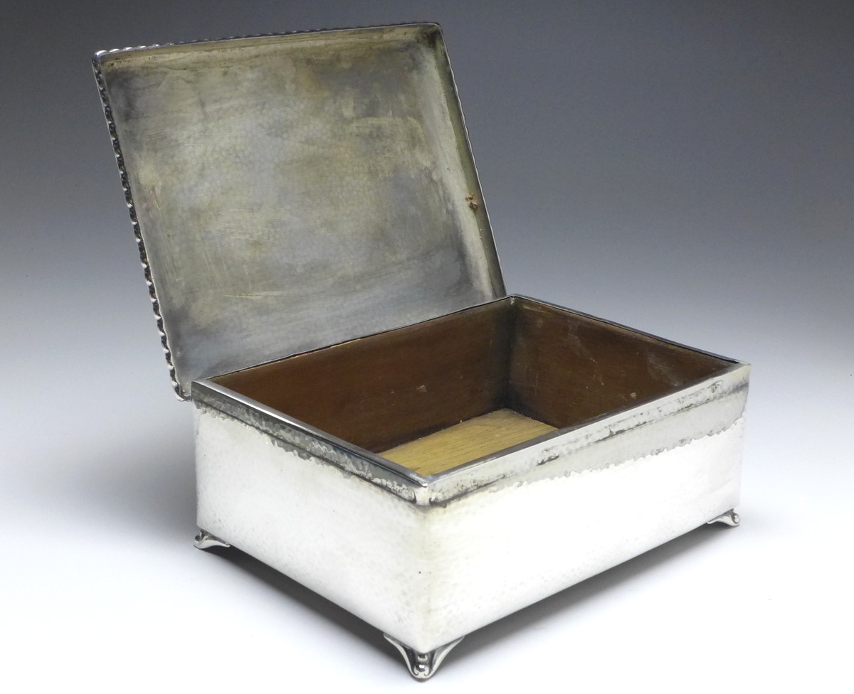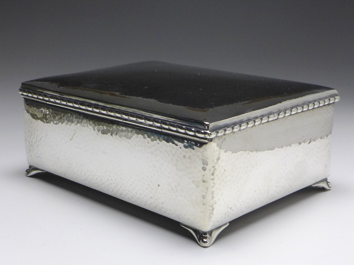große Schatulle, Deckeldose, Dose auf 4 Füßchen, Zigarrendose, Silber, punziert Dänemark, 1936, Punze Beschaumeister JS für Johannes Siggaard (tätig 1932-1960), Hammerschlagdekor, Deckel leicht nach aussen gewölbt, verzierter Rand, innen mit Holz. Alters- und Gebrauchsspuren. Guter gebrauchter Zustand.