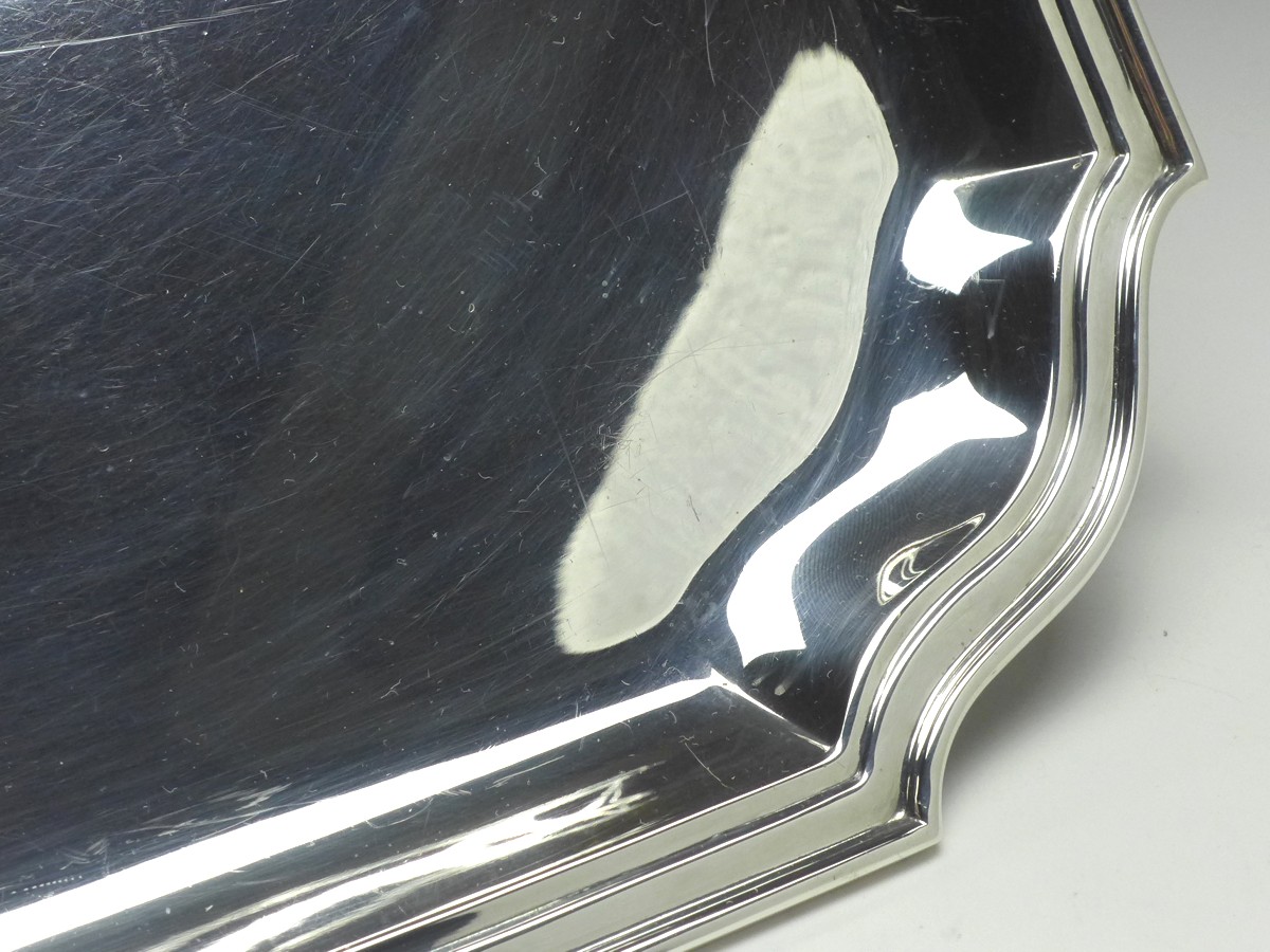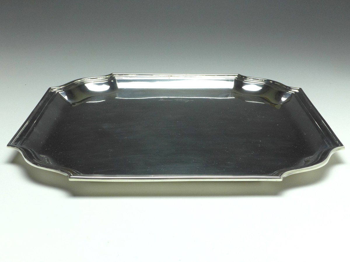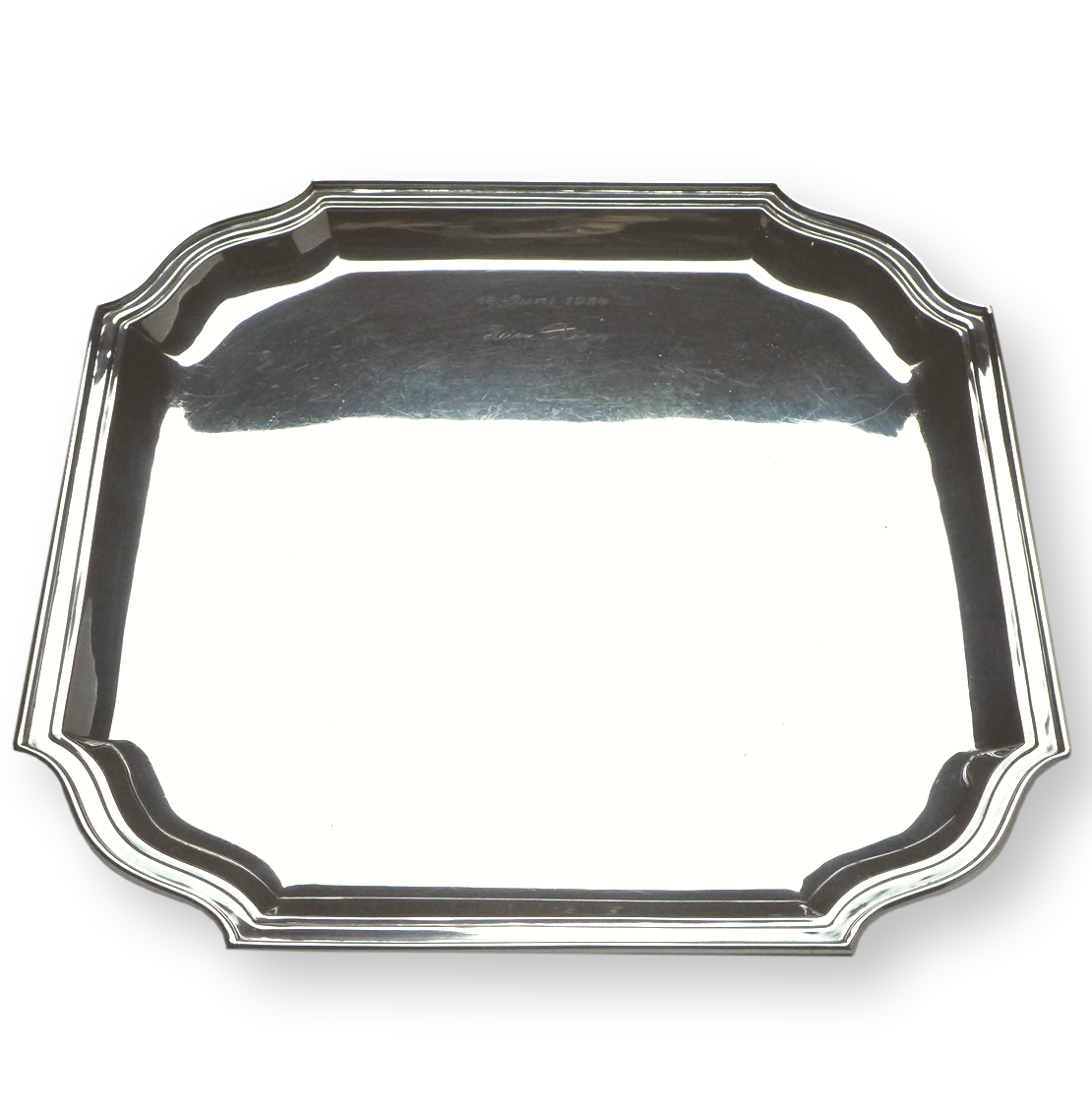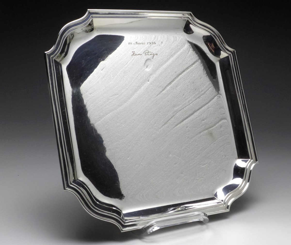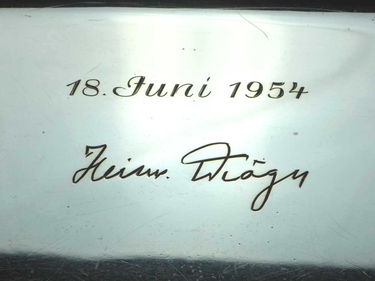 großes Tablett mit getrepptem Rand, 835er Silber, punziert Halbmond, Krone, 835, Punze Juwelier Goldemann, Hamburg. Alters- und Gebrauchsspuren. Guter gebrauchter Zustand. Mit Widmung 18. Juni 1954, Name.