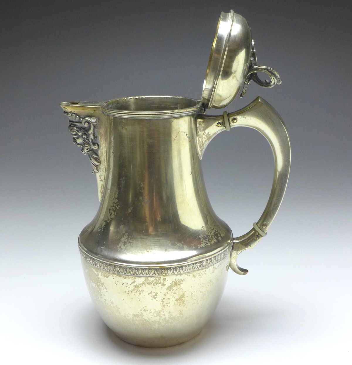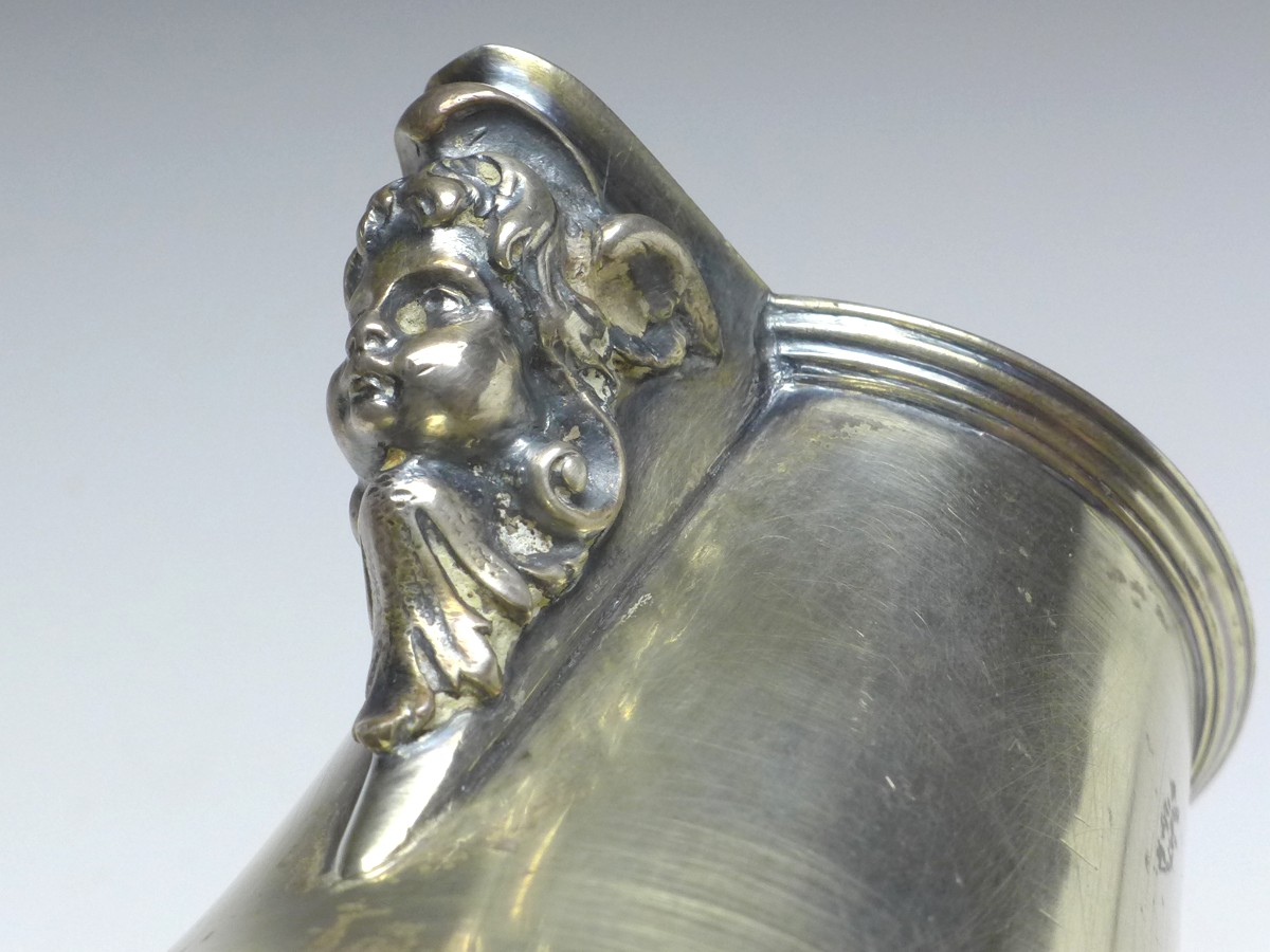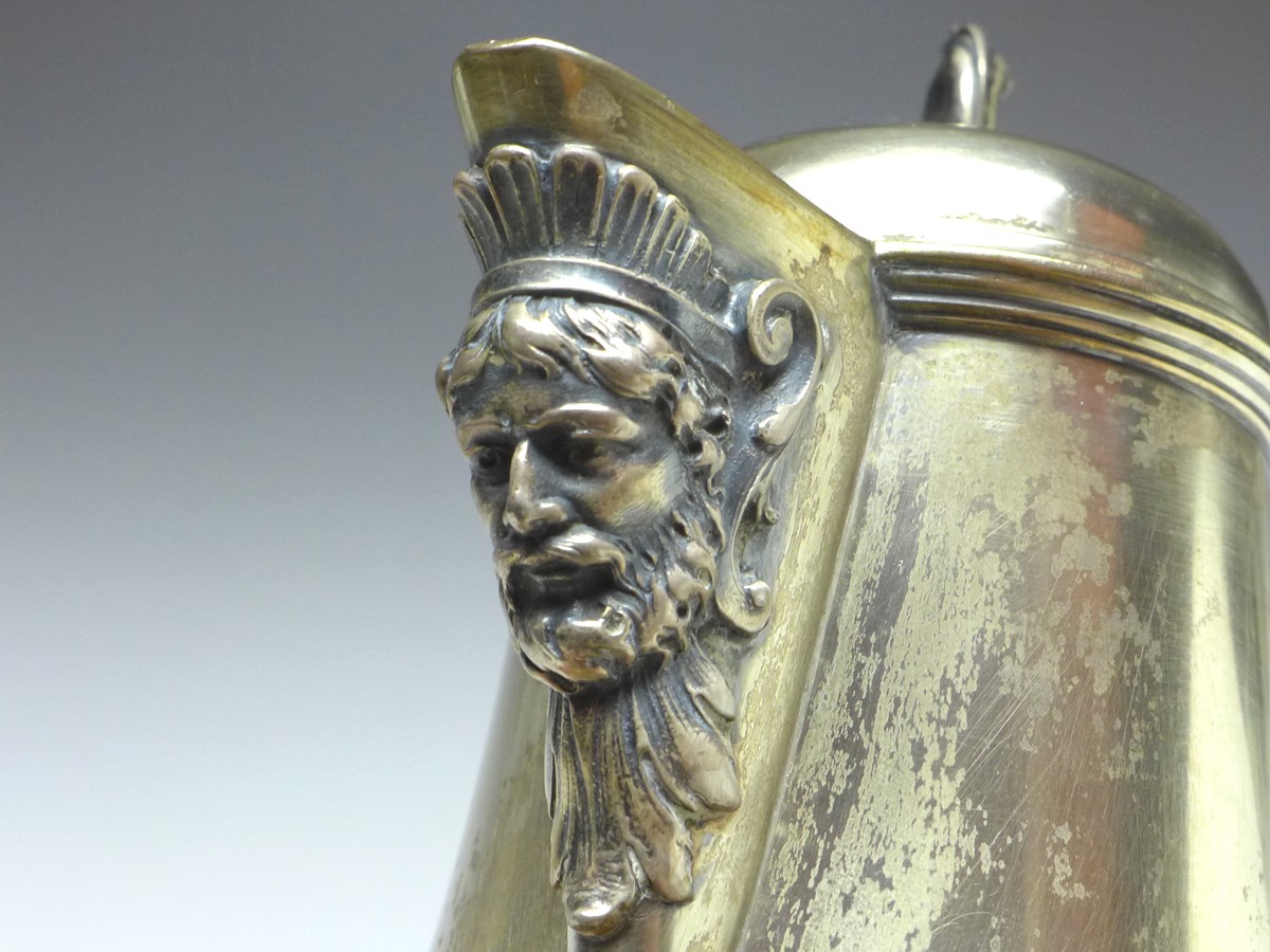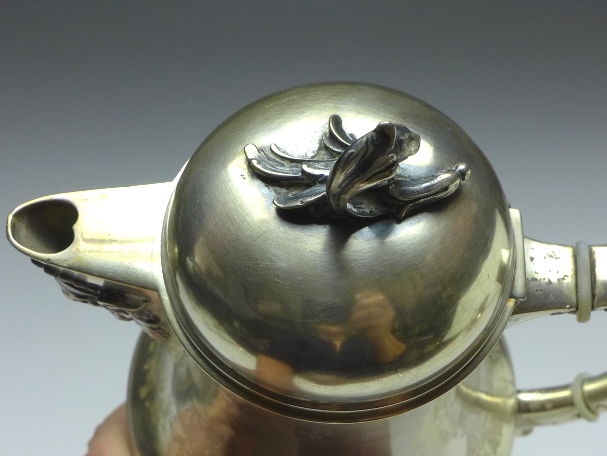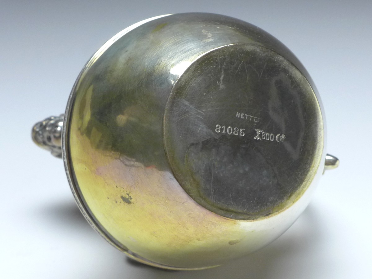 Kaffeekern, 3-tlg., bestehend aus Kanne, Zuckerschale, Gießer, Ausgüsse verziert mit verschiedenen plastischen Maskeronen. Koch & Bergfeld, Bremen, 800er Silber, punziert Netter, 31082, 31084, 31085, Herstellermarke, 800, Halbmond, Krone. Alters- und Gebrauchsspuren. Guter gebrauchter Zustand.