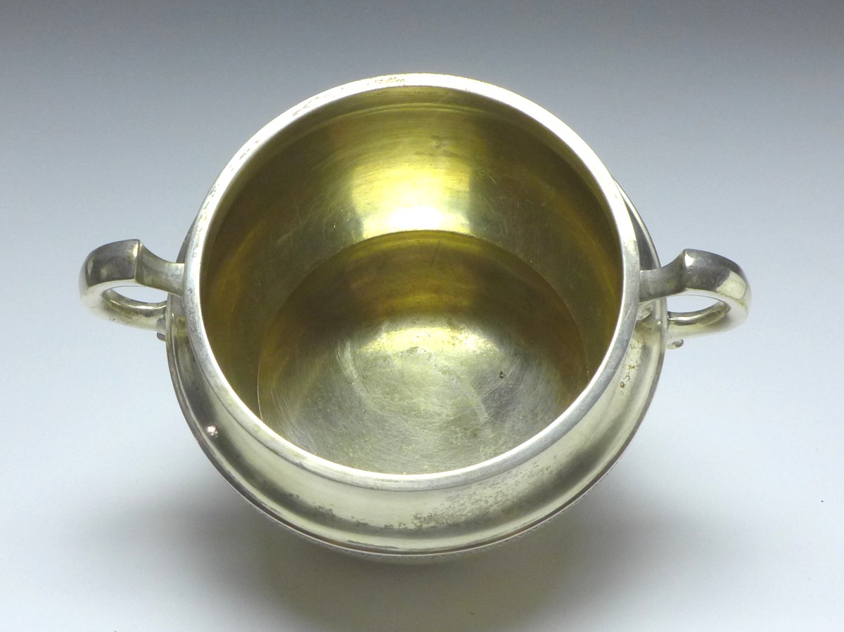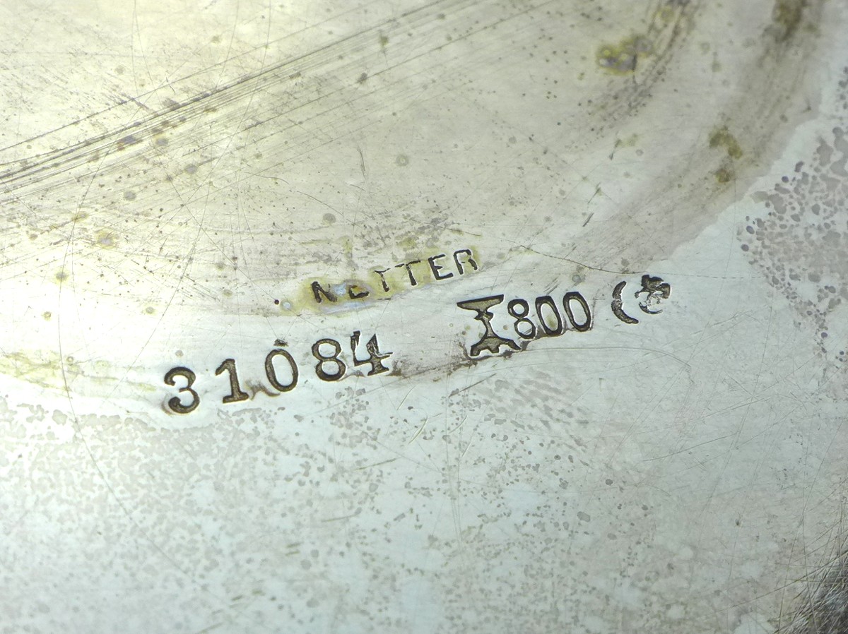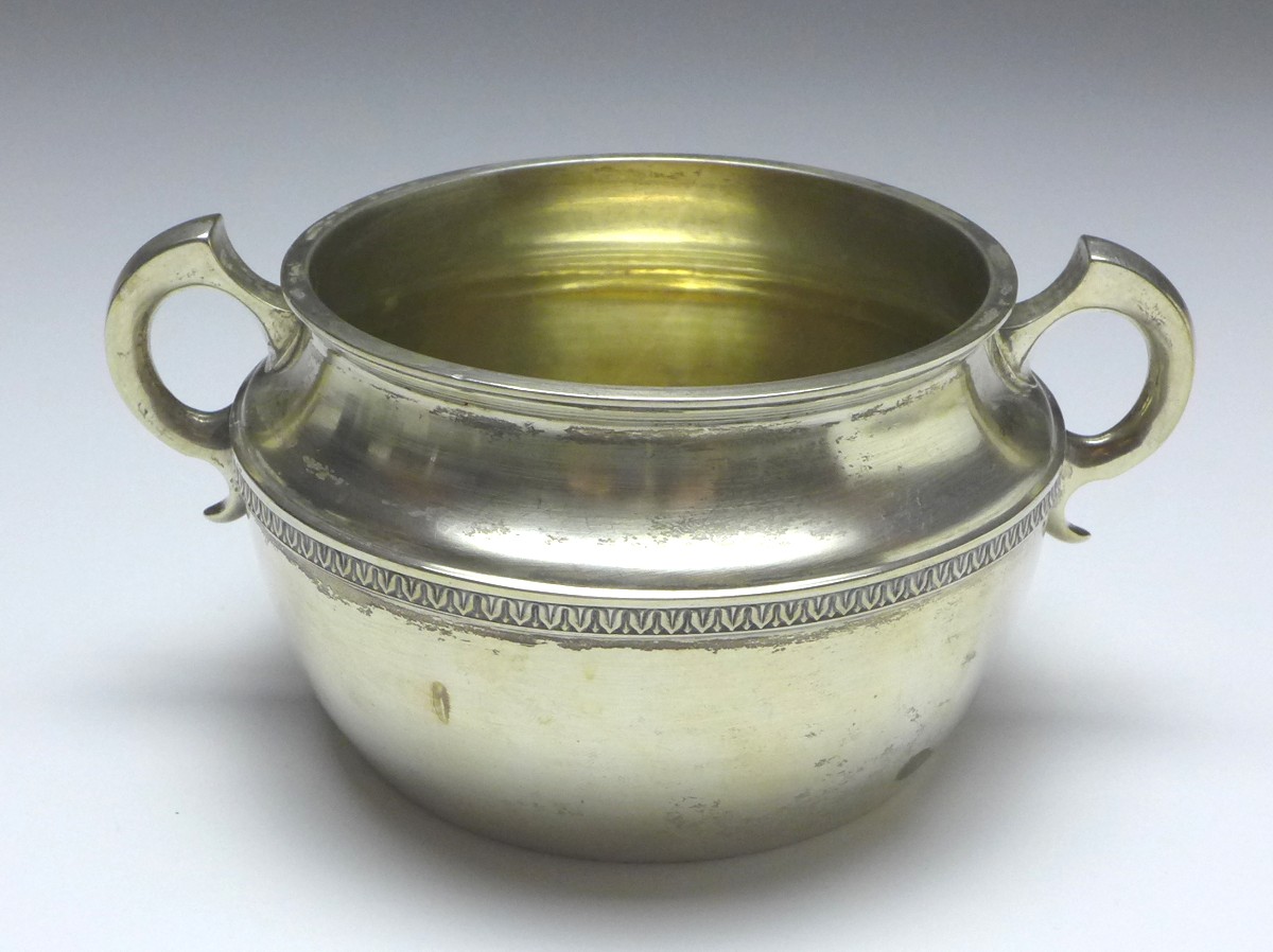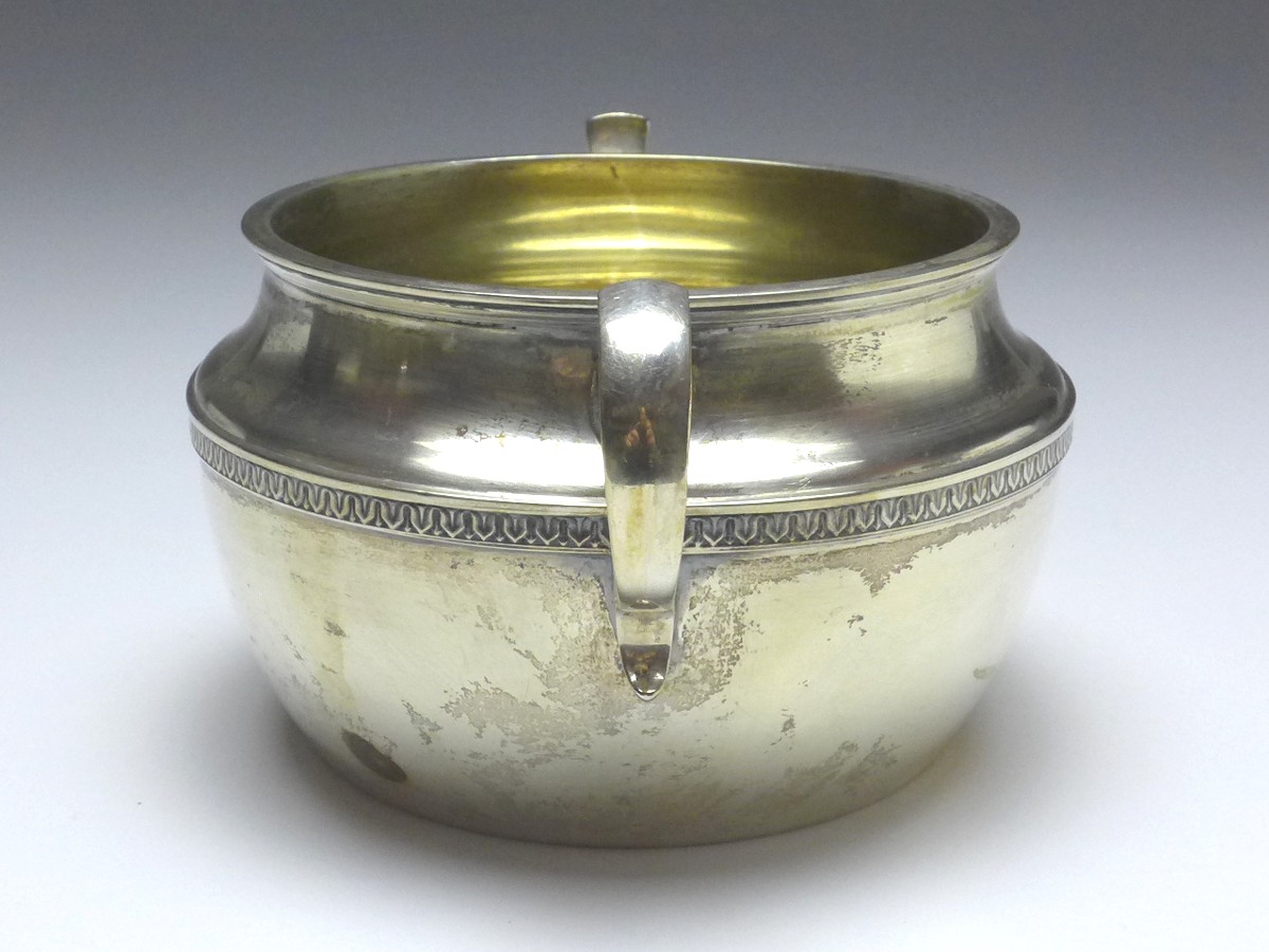 Maße: ca. Kanne: H: 22,5 cm, B: 17 cm, Gewicht 617 g; Zuckerschale: H: 7 cm, B: 14 cm, Gewicht 215 g; Gießer: H: 10 cm, B: 10 cm, Gewicht 183 g