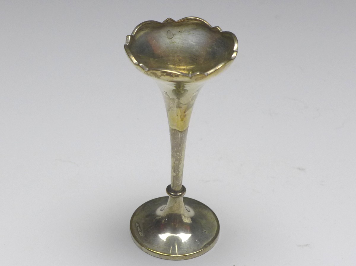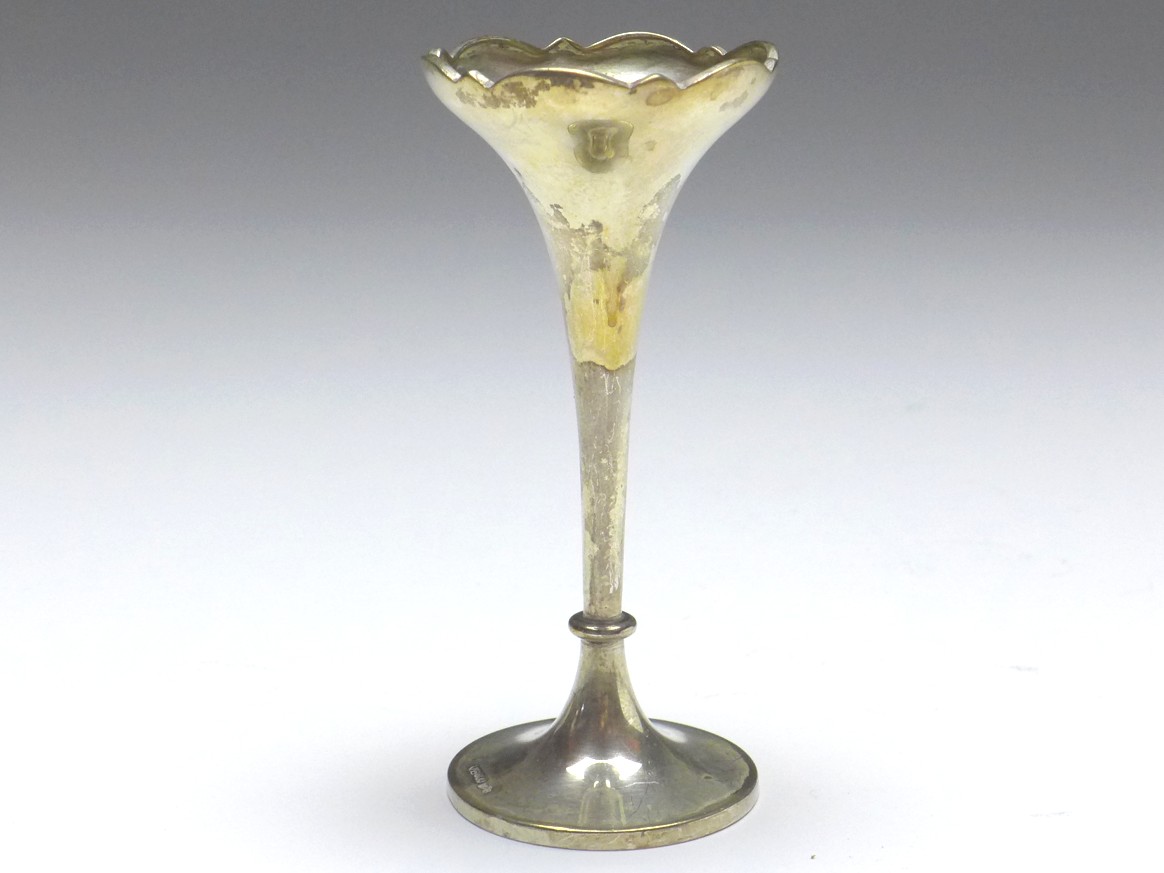 kleine Vase in Blütenform, Blumenvase, Tischvase, Wilhelm Binder, Schwäbisch Gmünd, 800er Silber, punziert Halbmond, Krone, Herstellerpunze WTB. Alters- und Gebrauchsspuren. Guter gebrauchter Zustand.