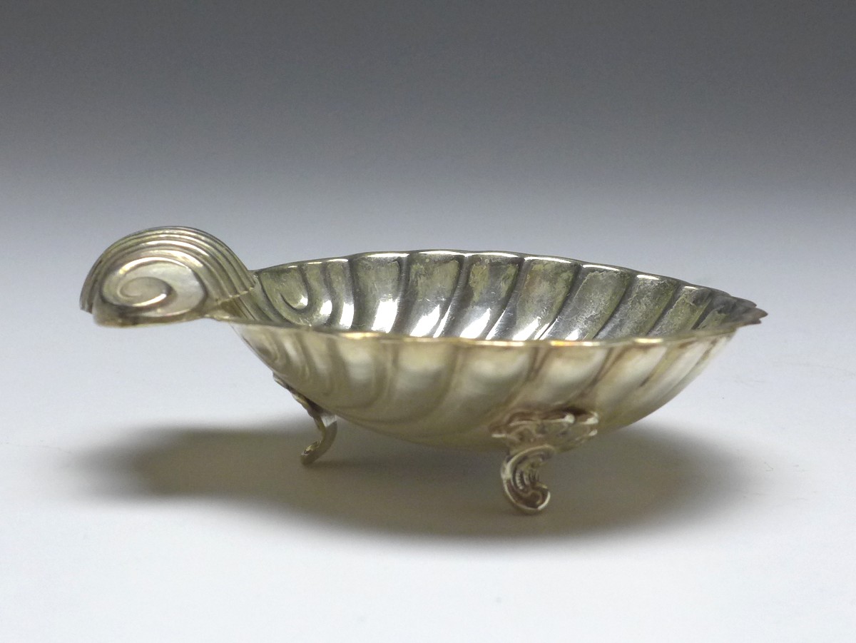 Muschelschale auf Füßchen, Kaviarschale, 925er Sterling Silber, punziert, Herstellerpunzen. Alters- und Gebrauchsspuren. Guter gebrauchter Zustand.