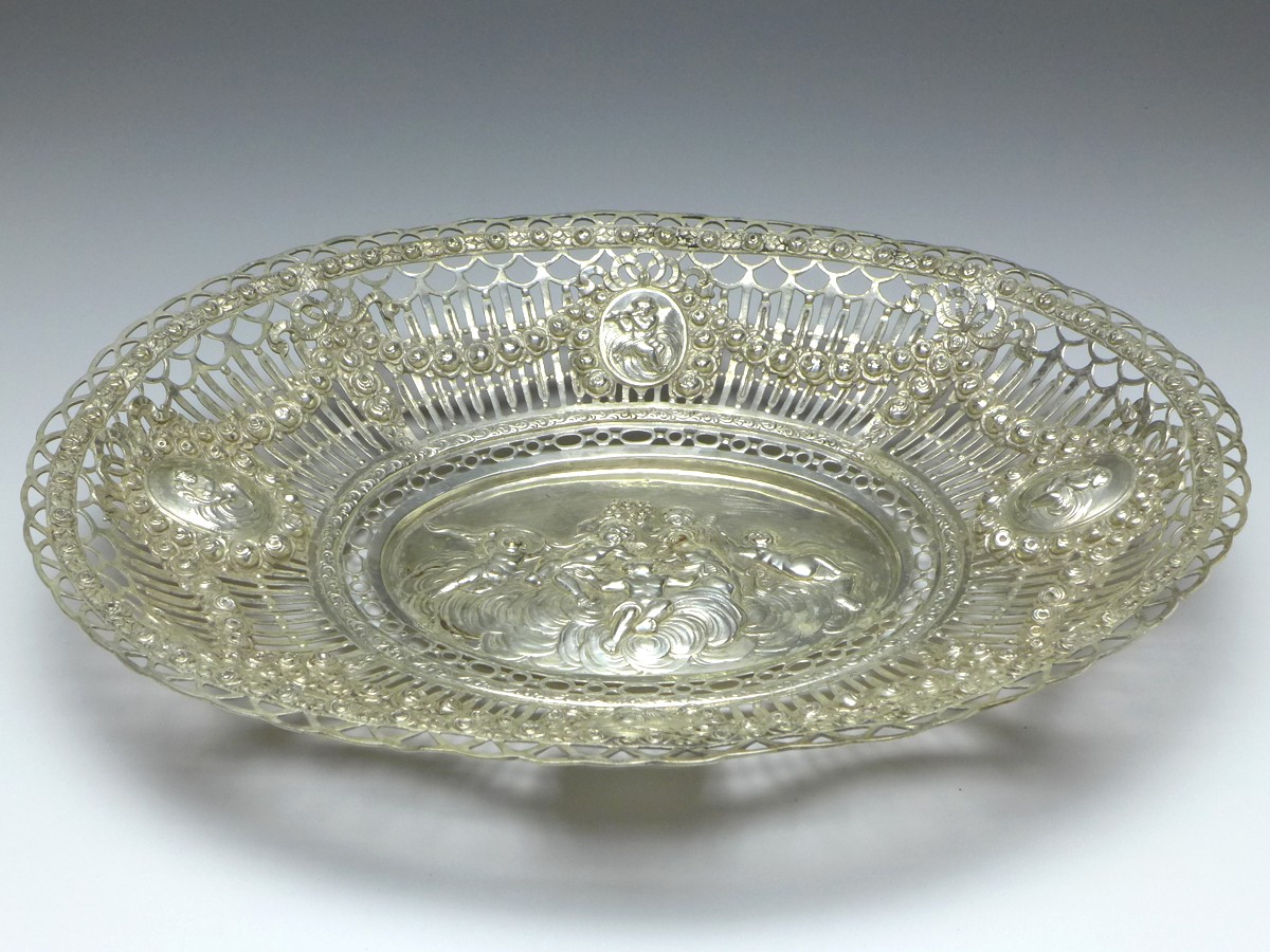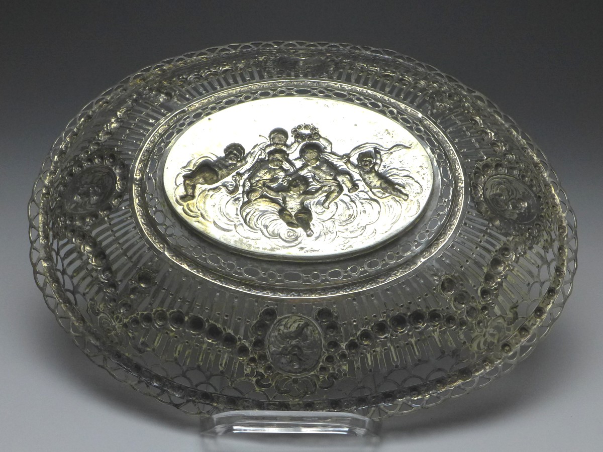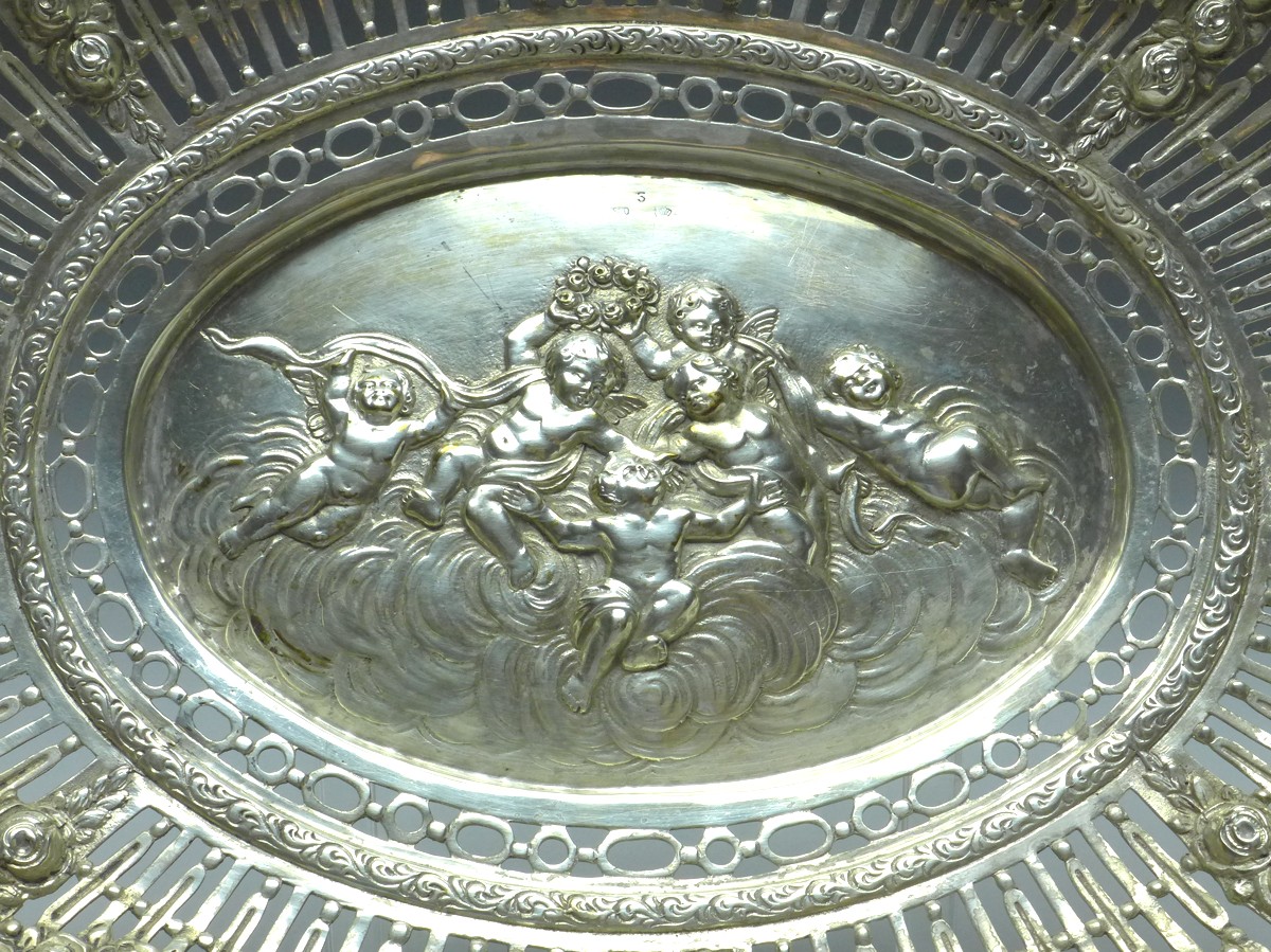 ovale Schale mit durchbrochenem Rand, Korb, Brotschale, Obstschale, 800er Silber, punziert Halbmond, Krone, 3. Durchbrochener Rand mit 4 Medaillons mit musizierenden Putti und Blütengirlanden gestaltet. Im Boden Szene mit 6 Putti in den Wolken mit Blütenkranz und Bändern. Alters- und Gebrauchsspuren. Guter gebrauchter Zustand.