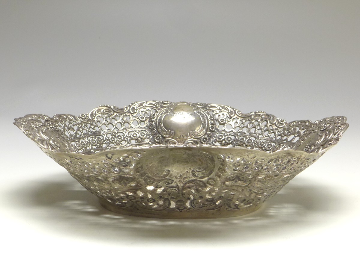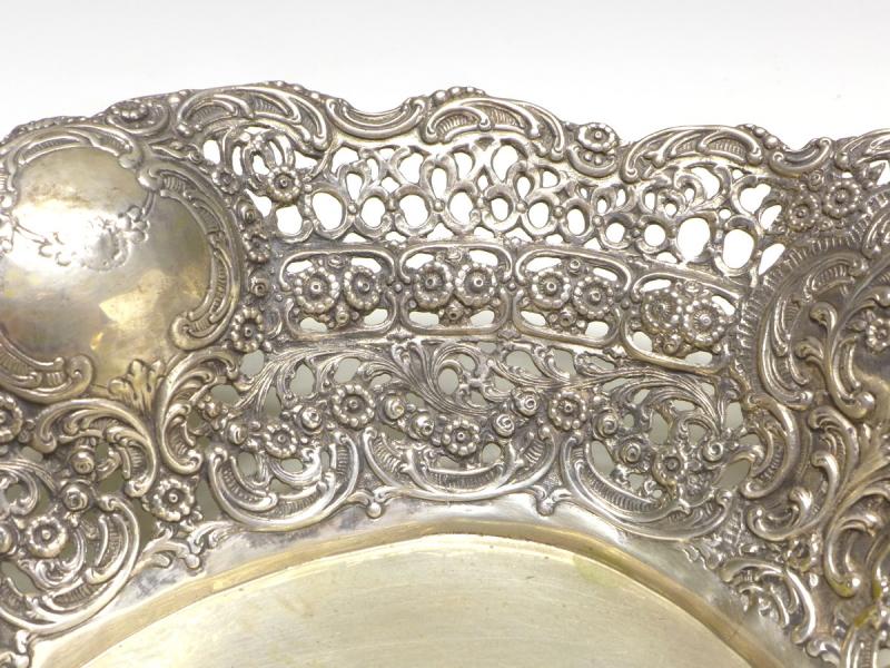 ovale Schale, durchbrochener Rand mit Blüten und Medaillons, 835er Silber, punziert. Alters- und Gebrauchsspuren. Guter Zustand.