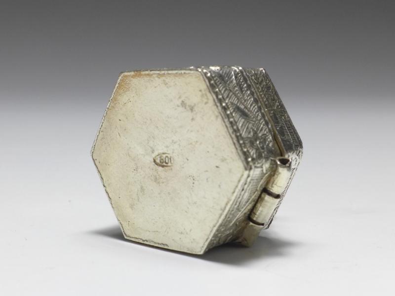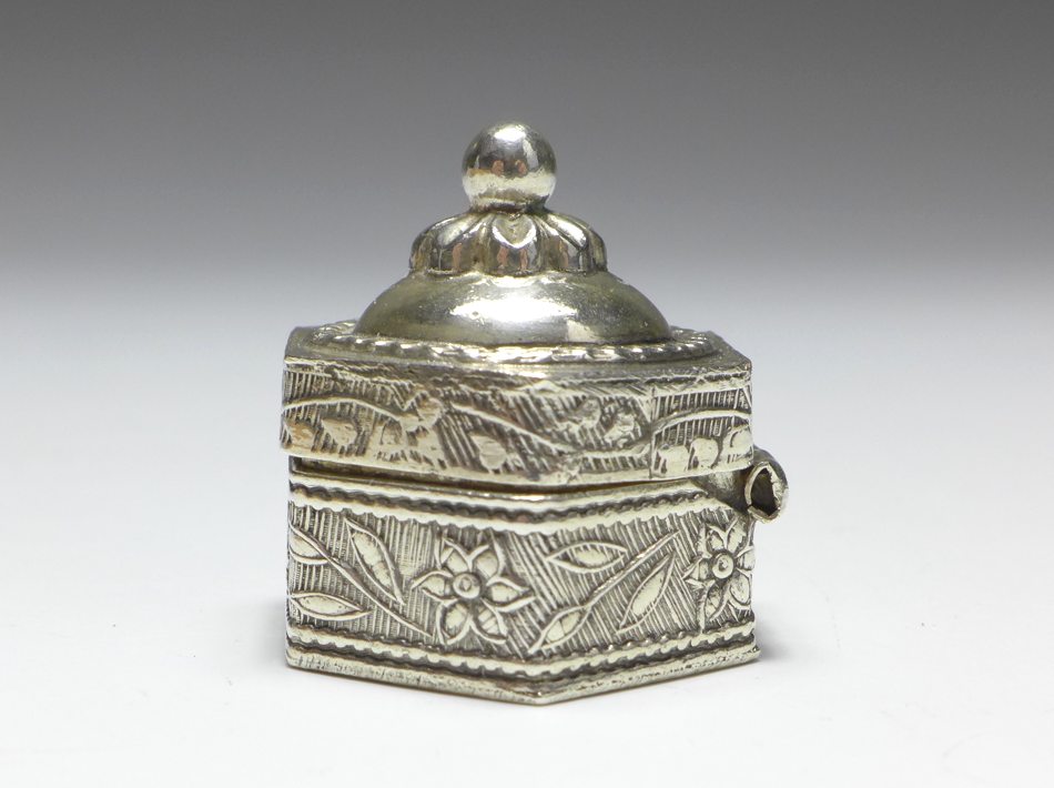 Pillendöschen als Schatztruhe, 800er Silber punziert. Deckel als Kuppel, Rand mit Blüten. Guter gebrauchter Zustand.
