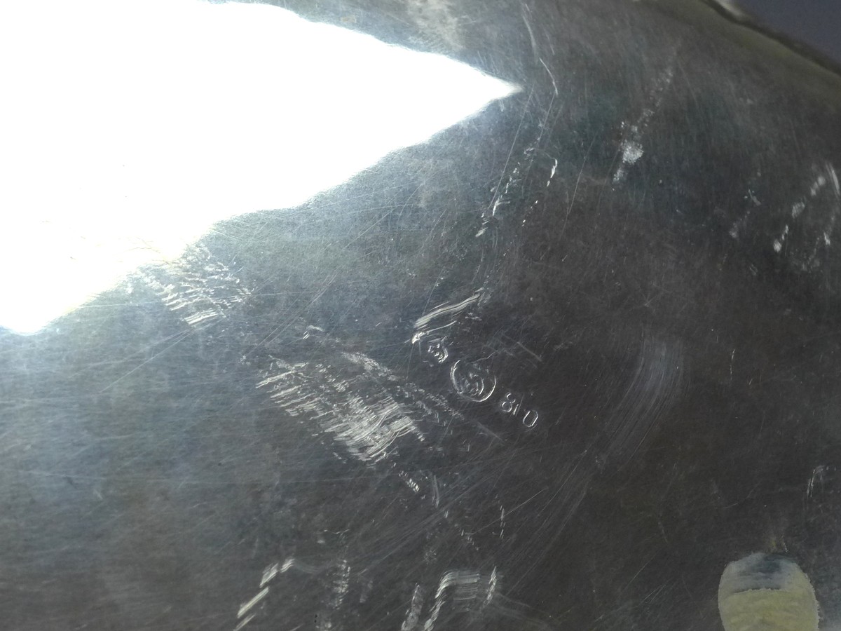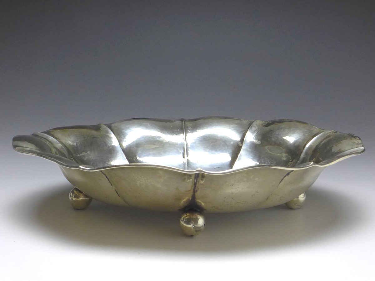 ovale Schale auf 4 Kugelfüßen, 800er Silber, punziert Halbmond, Krone, Herstellermarke, 800. Hammerschlagdekor. Alters- und Gebrauchsspuren. Guter gebrauchter Zustand.