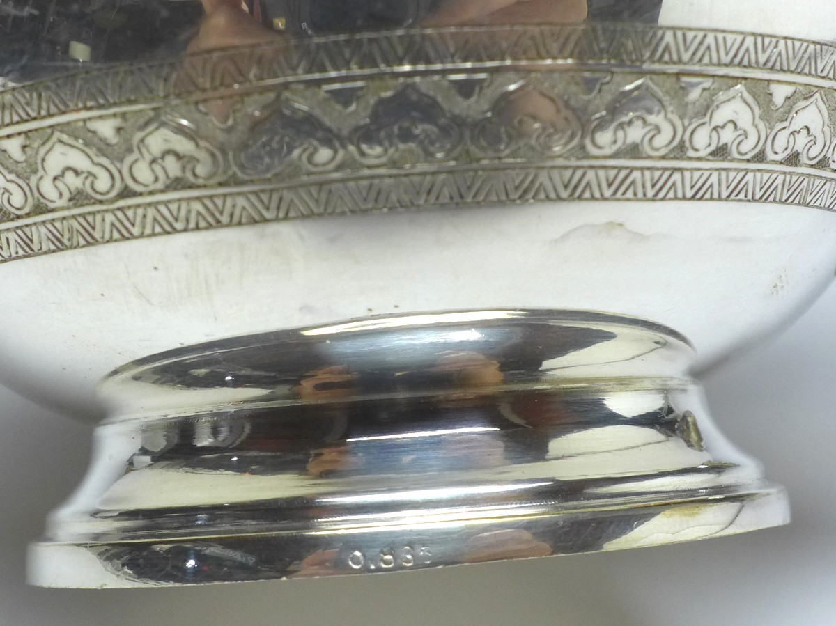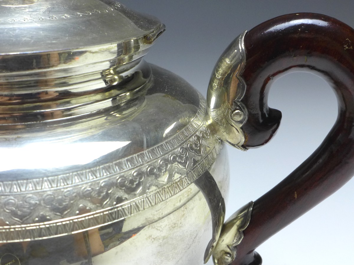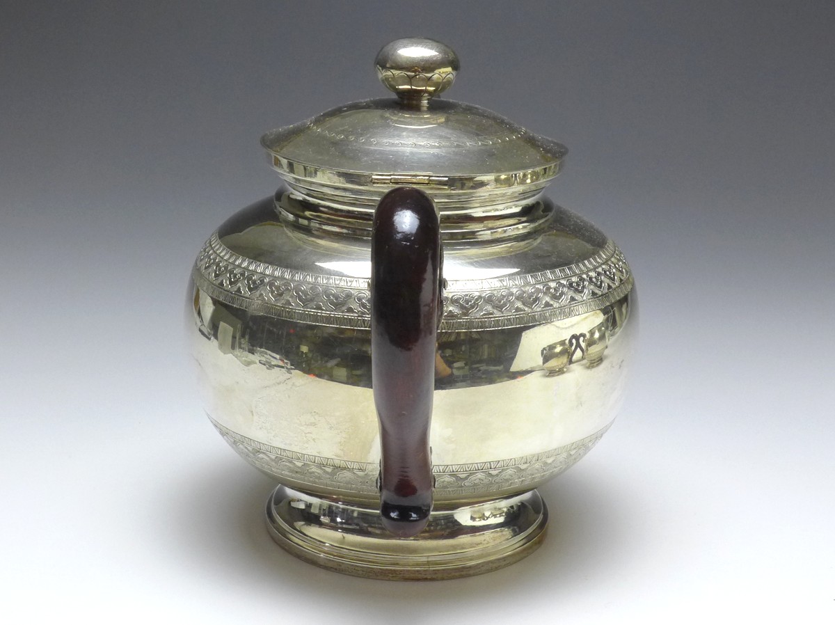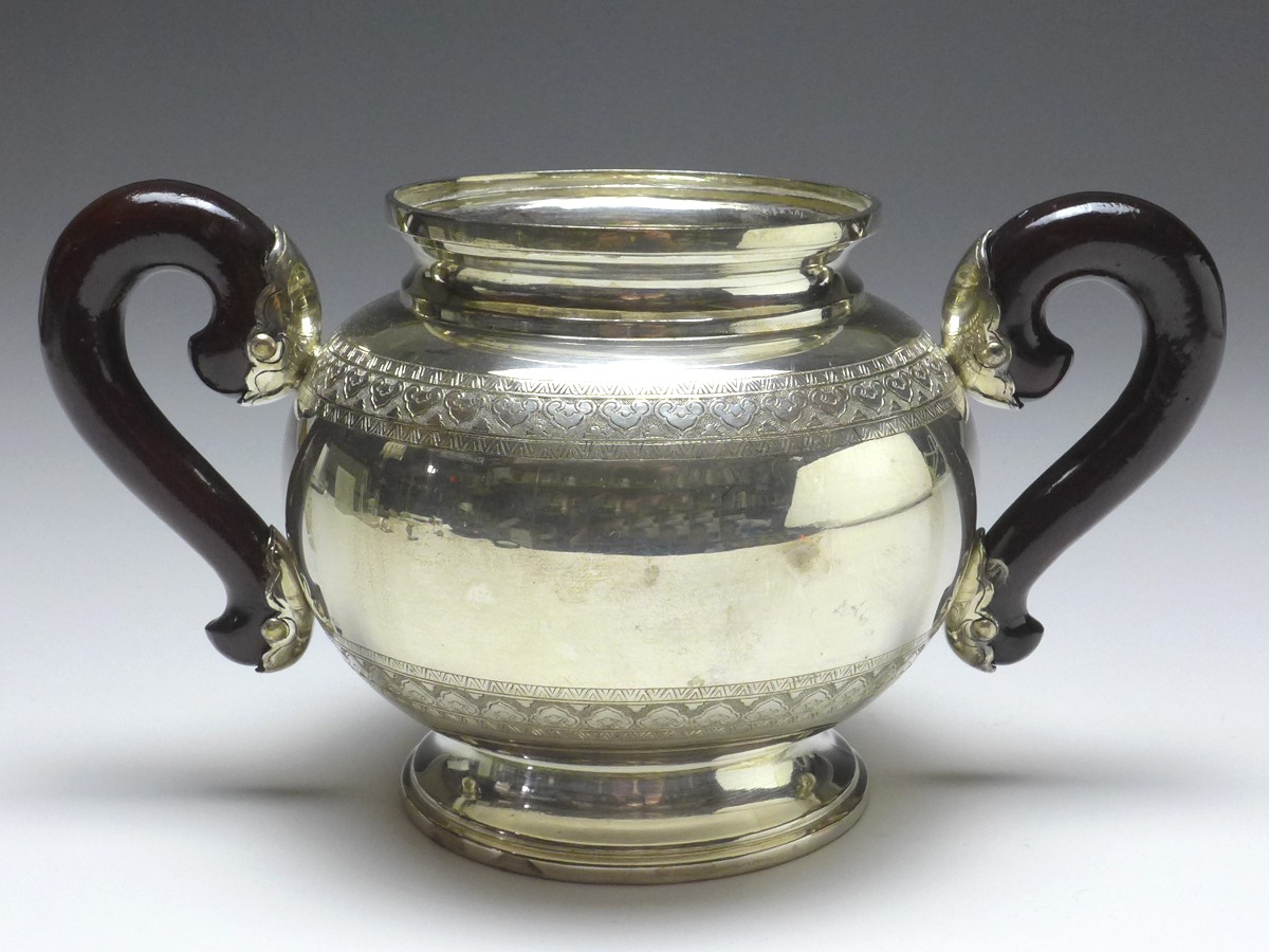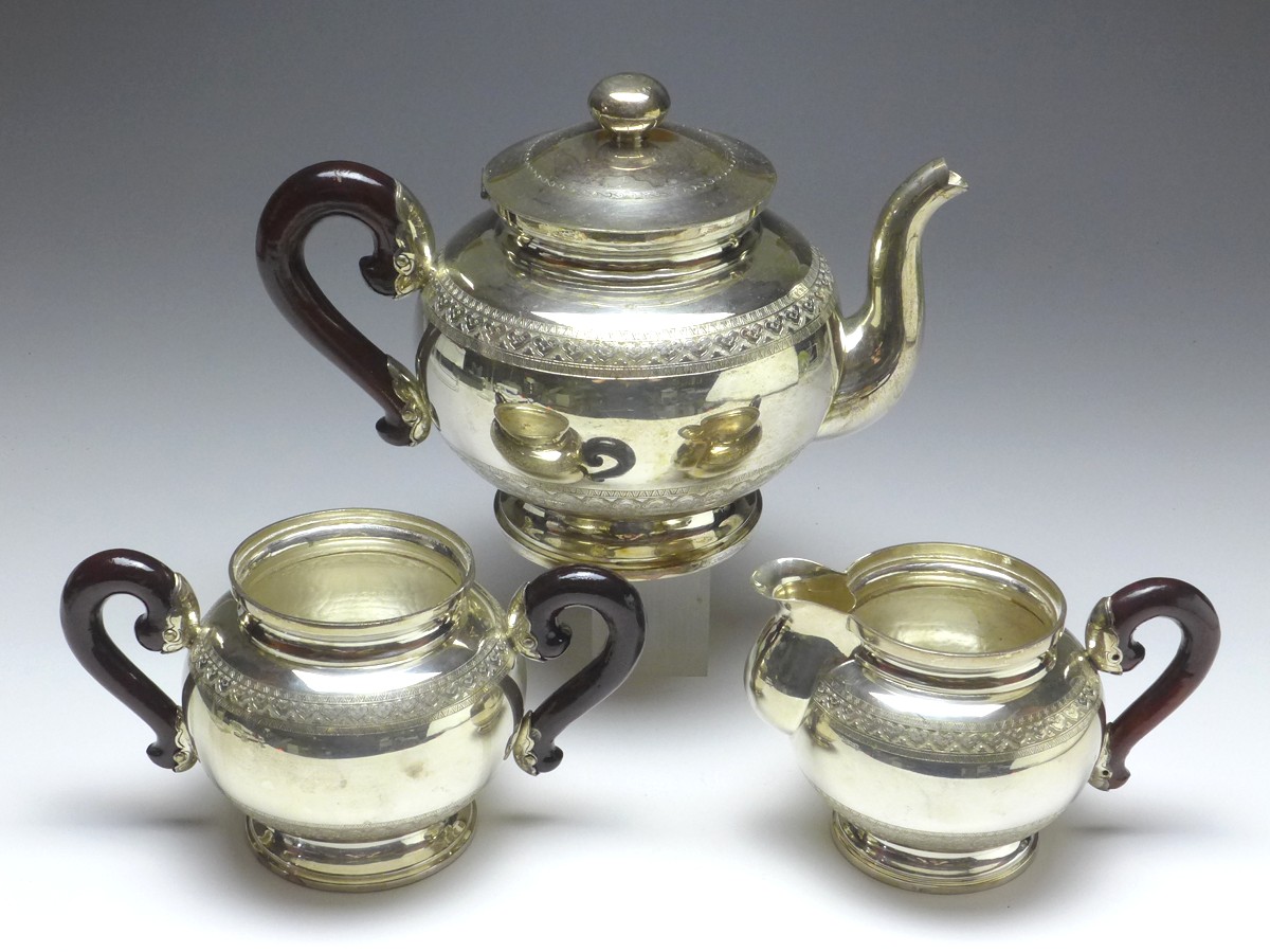 Teekern, Tee-Set 3-teilig, 835er Silber, punziert. Bestehend aus Teekanne, Zuckerschale, Gießer, jeweils mit Holzhenkel. Alters- und Gebrauchsspuren. Guter Zustand, scheinbar unbenutzt.