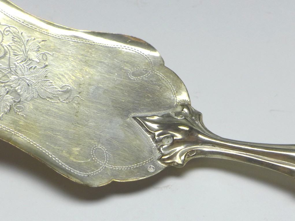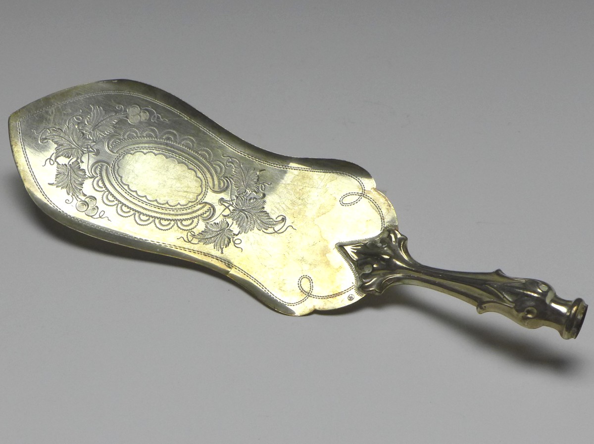 Tortenheber, Dekor mit Trauben und Weinblättern. 13 Lot Silber, punziert. Alters- und Gebrauchsspuren. Guter gebrauchter Zustand. Ohne Holzgriff.