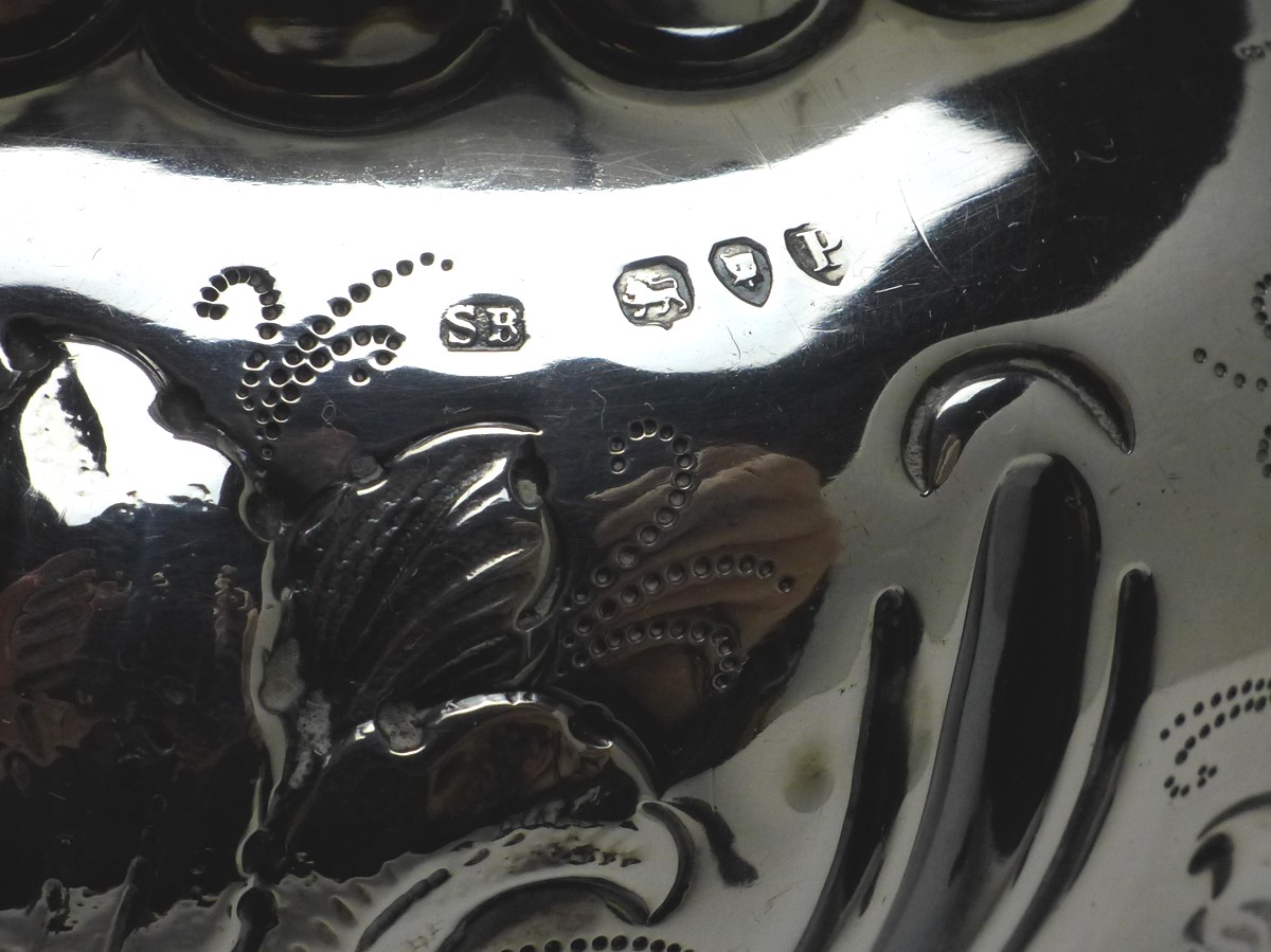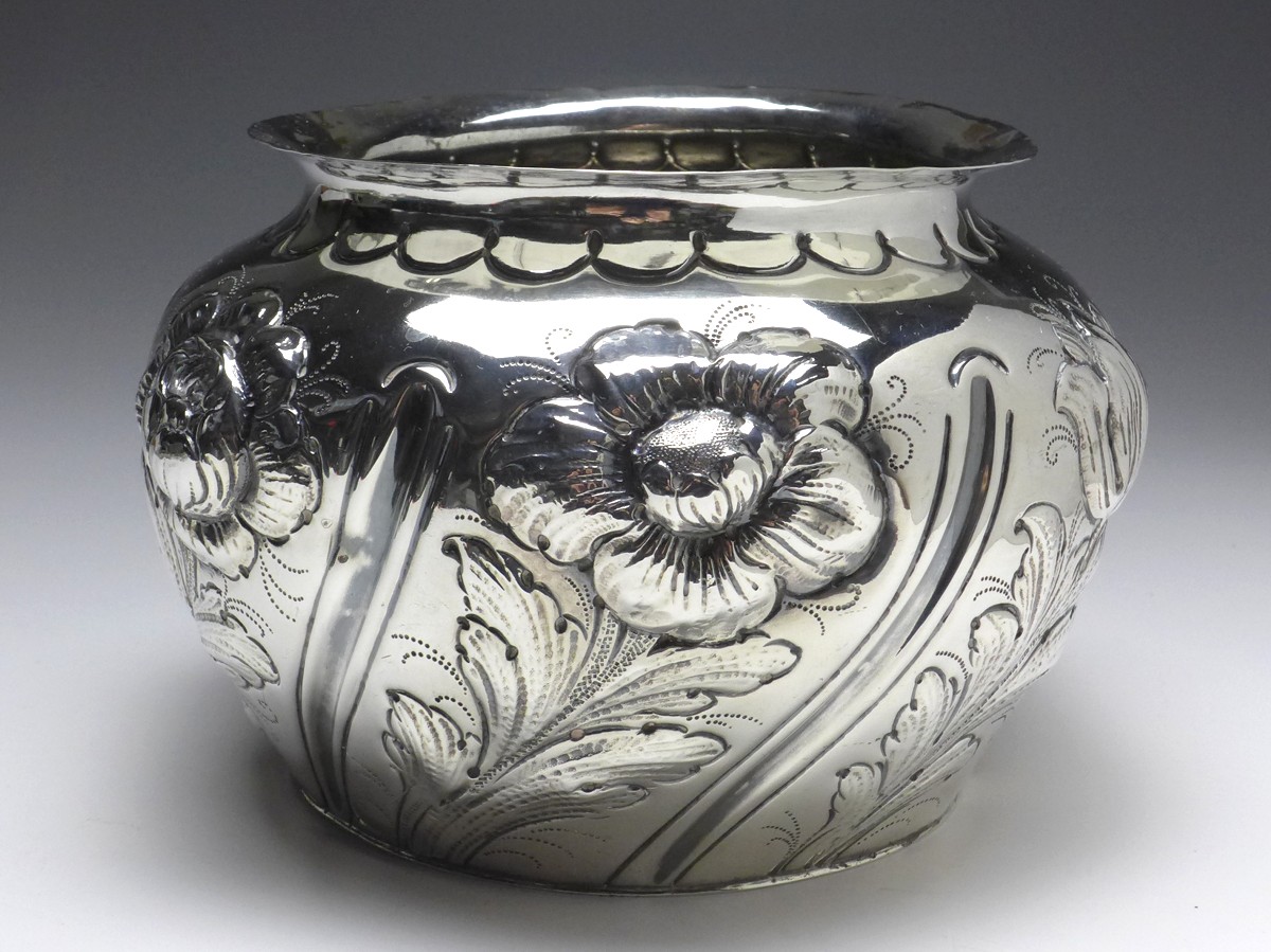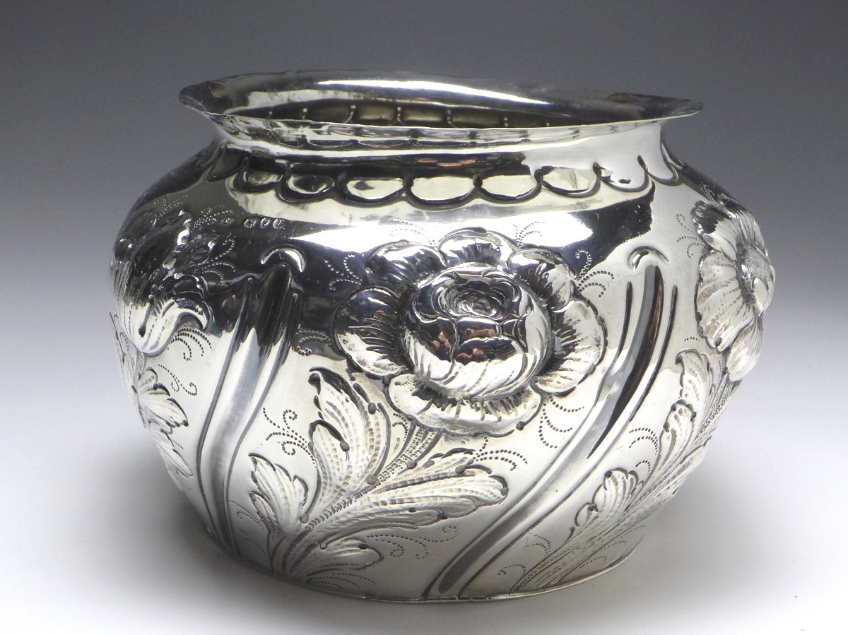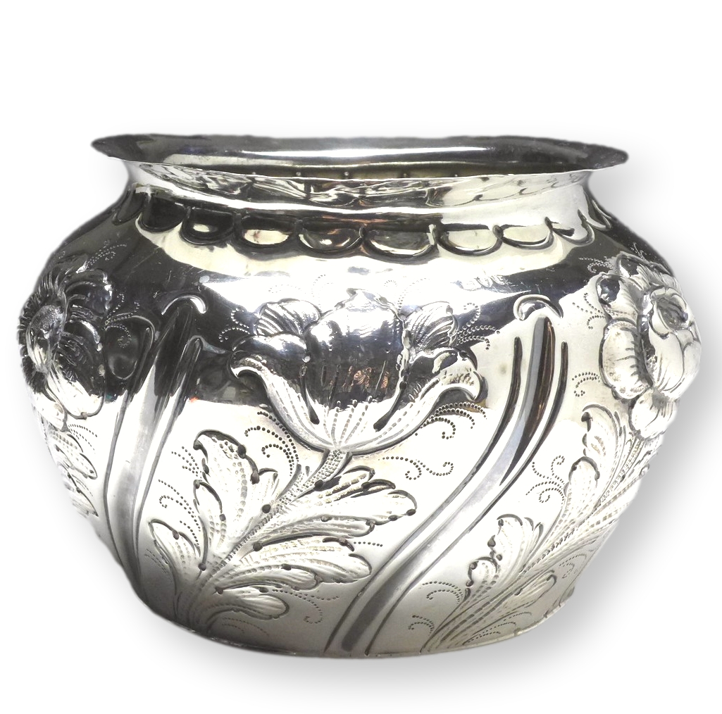 sehr dekorative Vase, Blumenvase, 925er Sterling Silber, gepunzt London, 1890, SB = Susannah Brasted (ca. 1888-1894). In Kugelform, umlaufendes Blumendekor mit verschiedenen Blumen, Rand verziert. Alters- und Gebrauchsspuren. Guter gebrauchter Zustand.