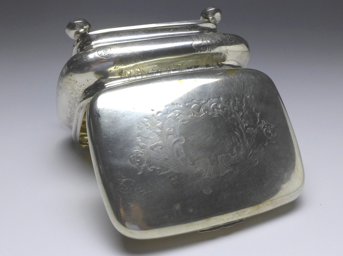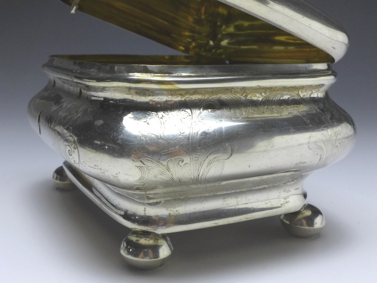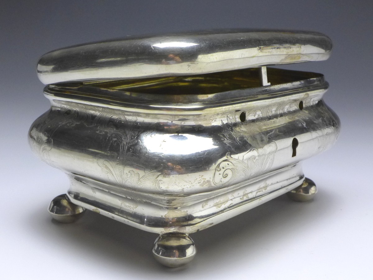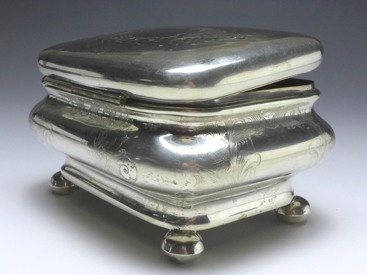 Zuckerdose, Deckeldose auf 4 Kugelfüßen, vor 1888, 12 Lot (750er) Silber, punziert G. H. 12. Gebauchte Wandung, auf 4 Kugelfüßen, innen vergoldet. Auf allen Seiten mit floralem Dekor - Akanthusblätter, Rosenblüten. Auf Deckel mit Monogrammfeld, dieses frei. Alters- und Gebrauchsspuren. Guter gebrauchter Zustand. Schloß und Schlüssel fehlt. Innen Kratzer.
