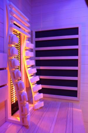 Die komfortable Infrarotkabine mit ergonomischer Rückenlehne und zusätzlichen Fronteckstrahlern. Einfach zurücklehnen und sofort bei gewünschtem Licht und Musik z.B. vom Smartphone entspannen. Die ergonomischen Rückenlehnen aus Espenholz passen sich ihrem Körper an und unterstützen den Rücken für eine gerade Haltung. Der Infrarotstrahler wird nicht durch eine Holzblende verdeckt.