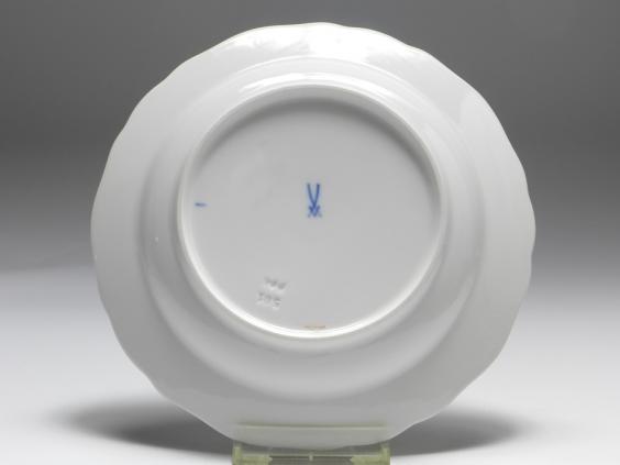 Teller, Kuchenteller, Meissen, 1. Wahl, feine bunte Blumenmalerei Blume 2 schräg - Bandwinde, Goldrand. Schwertermarke im Boden.