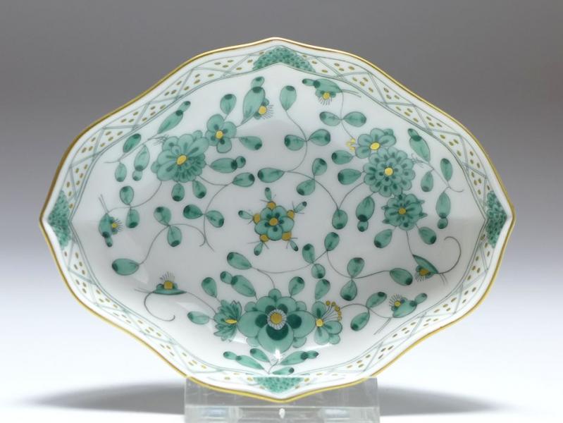 Schälchen oval. Meissen, 1. Wahl. Feine Handmalerei Indisch grün reich, Goldrand. Schwertermarke im Boden. Neu.