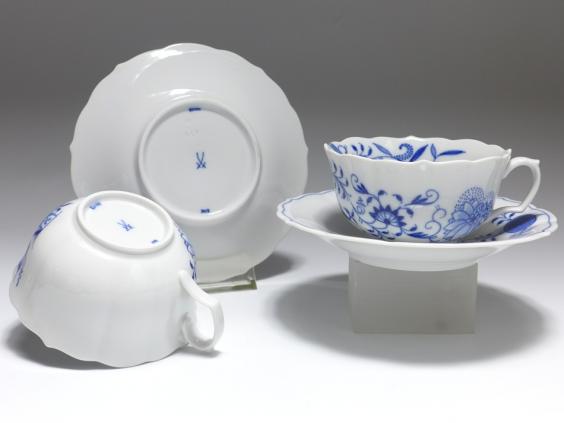 Set 2x Teetasse, Tasse mit Untere. Meissen, 1. Wahl, Unterglasurdekor Zwiebelmuster Style, kobaltblau. Schwertermarke im Boden. Neu.