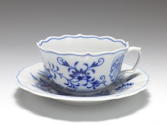 Teetasse, Tasse mit Untere. Meissen, 1. Wahl. Unterglasurdekor Zwiebelmuster. Schwertermarke im Boden. Neu.